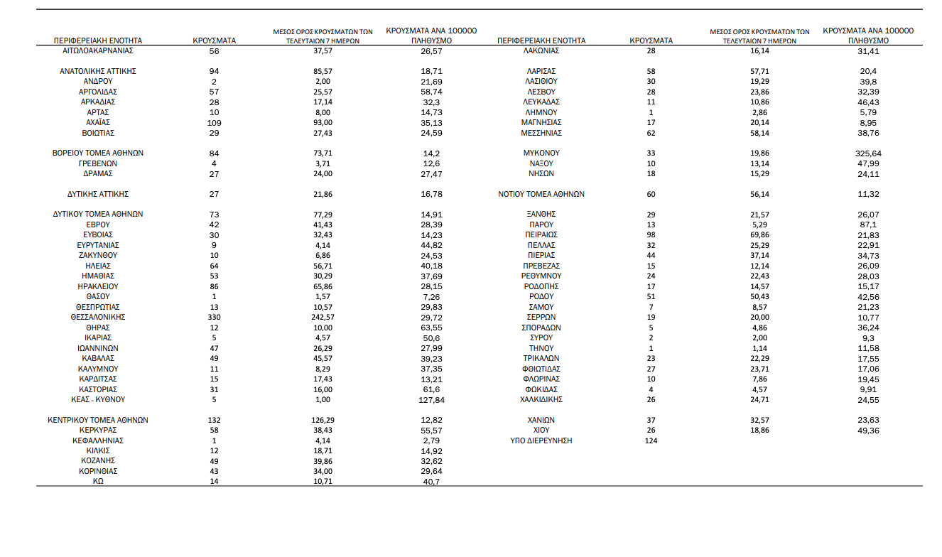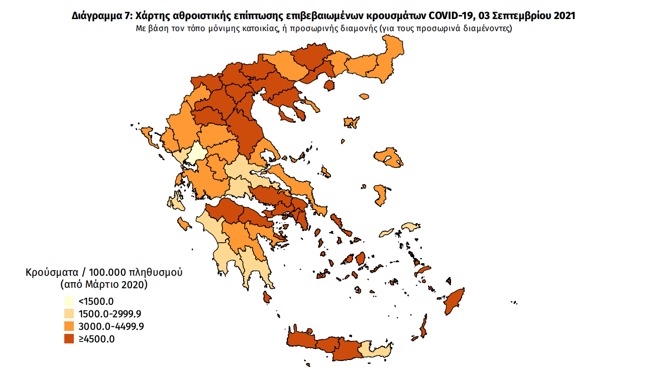 Κατανομή ανακοινωθέντων εγχώριων κρουσμάτων: Από το σύνολο των 2.729 νέων κρουσμάτων του νέου ιού στη χώρα 17 είναι εισαγόμενα εκ των οποίων 13 εντοπίστηκαν κατόπιν ελέγχων στις πύλες εισόδου της χώρας . Η κατανομή των 2.712 νέων εγχώριων κρουσμάτων ανά Περιφερειακή Ενότητα παρουσιάζεται στον κατωτέρω πίνακα.4 Πίνακας 2: Ημερήσιος αριθμός και κρούσματα ανά 100.000 πληθυσμού επιβεβαιωμένων εγχώριων κρουσμάτων COVID-19 ανά περιφερειακή ενότητα στις 03 Σεπτεμβρίου 2021 5