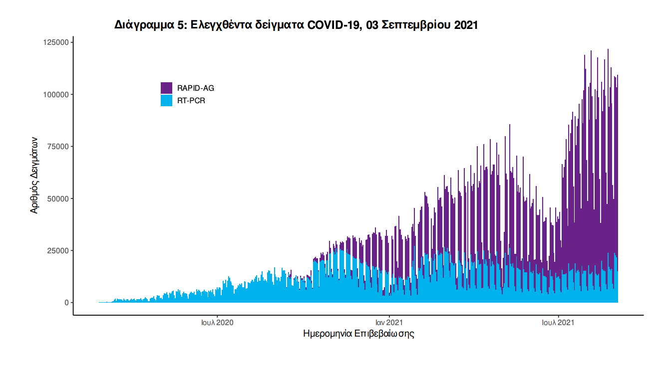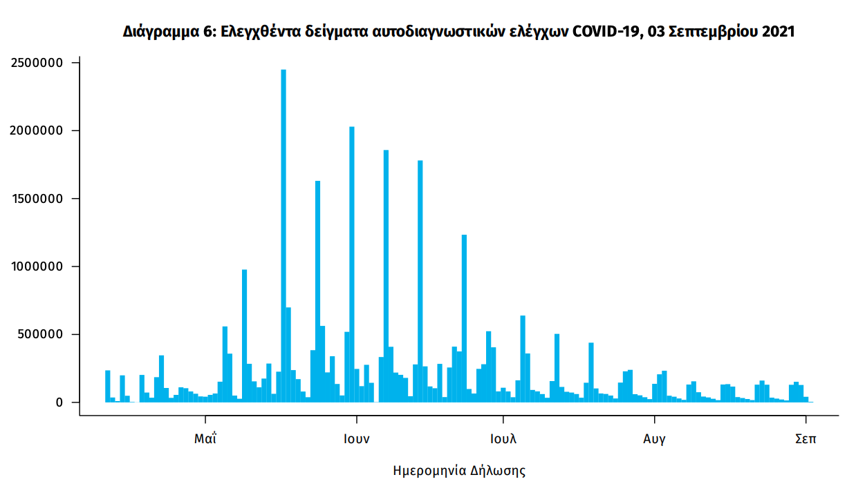 Δείγματα που έχουν ελεγχθεί: Από την 1η Ιανουαρίου 2020 μέχρι σήμερα, στα εργαστήρια που διενεργούν ελέγχους για τον νέο κορωνοϊό (SARS-CoV-2) και που δηλώνουν συστηματικά το σύνολο των δειγμάτων που ελέγχουν, έχουν συνολικά ελεγχθεί 6.280.218 κλινικά δείγματα ενώ από Μονάδες Υγείας και Κλιμάκια του ΕΟΔΥ που διενεργούν ελέγχους Rapid Ag έχουν ελεγχθεί 9.560.793 δείγματα. O μέσος όρος του επταημέρου είναι 90.203 δειγματοληπτικοί έλεγχοι. Αυτοδιαγνωστικοί έλεγχοι (Self-tests): Έως 02 Σεπτεμβρίου 2021, έχουν καταγραφεί ηλεκτρονικά 33.014.235 δηλώσεις αποτελέσματος αυτοδιαγνωστικού ελέγχου, ενώ 1.141.518 άτομα προσήλθαν για επανέλεγχο. Mαζικές Δειγματοληψίες ΕΟΔΥ: Στις 02 Σεπτεμβρίου 2021, πραγματοποιήθηκαν 154 δράσεις δειγματοληπτικών ελέγχων από τις Κινητές Ομάδες Υγείας (ΚΟΜΥ) του ΕΟΔΥ, στις οποίες διενεργήθηκαν 35.737 έλεγχοι Rapid Ag και ανευρέθηκαν 536 θετικά (1,5%).