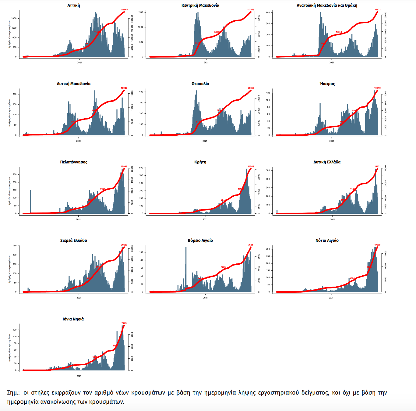 Παράρτημα 1: Επιδημικές καμπύλες κρουσμάτων COVID-19 με βάση την δηλωθείσα διεύθυνση μόνιμης κατοικίας του κρούσματος ή τη διεύθυνση προσωρινής διαμονής για τους τουρίστες και άλλους προσωρινά διαμένοντες στην Ελλάδα. Συμπεριλαμβάνονται τόσο κρούσματα με ιστορικό ταξιδίου όσο και κρούσματα με πιθανή εγχώρια μετάδοση.