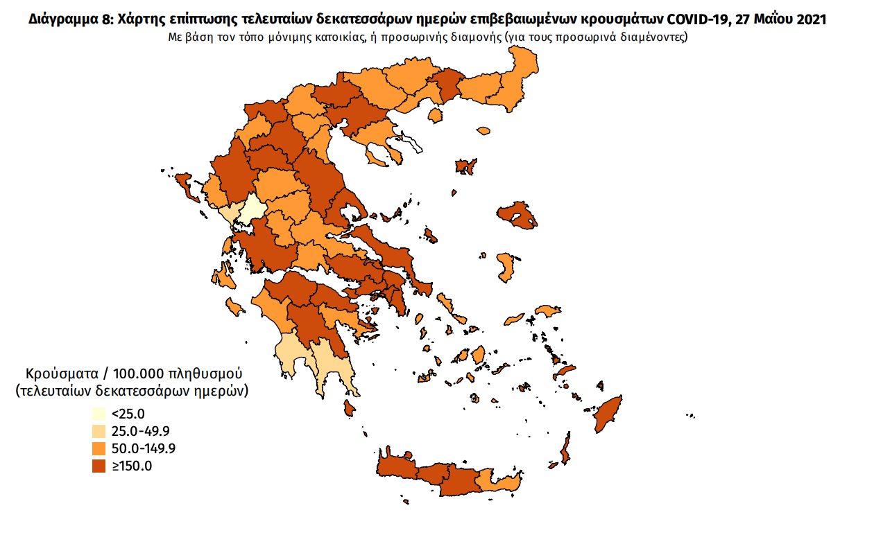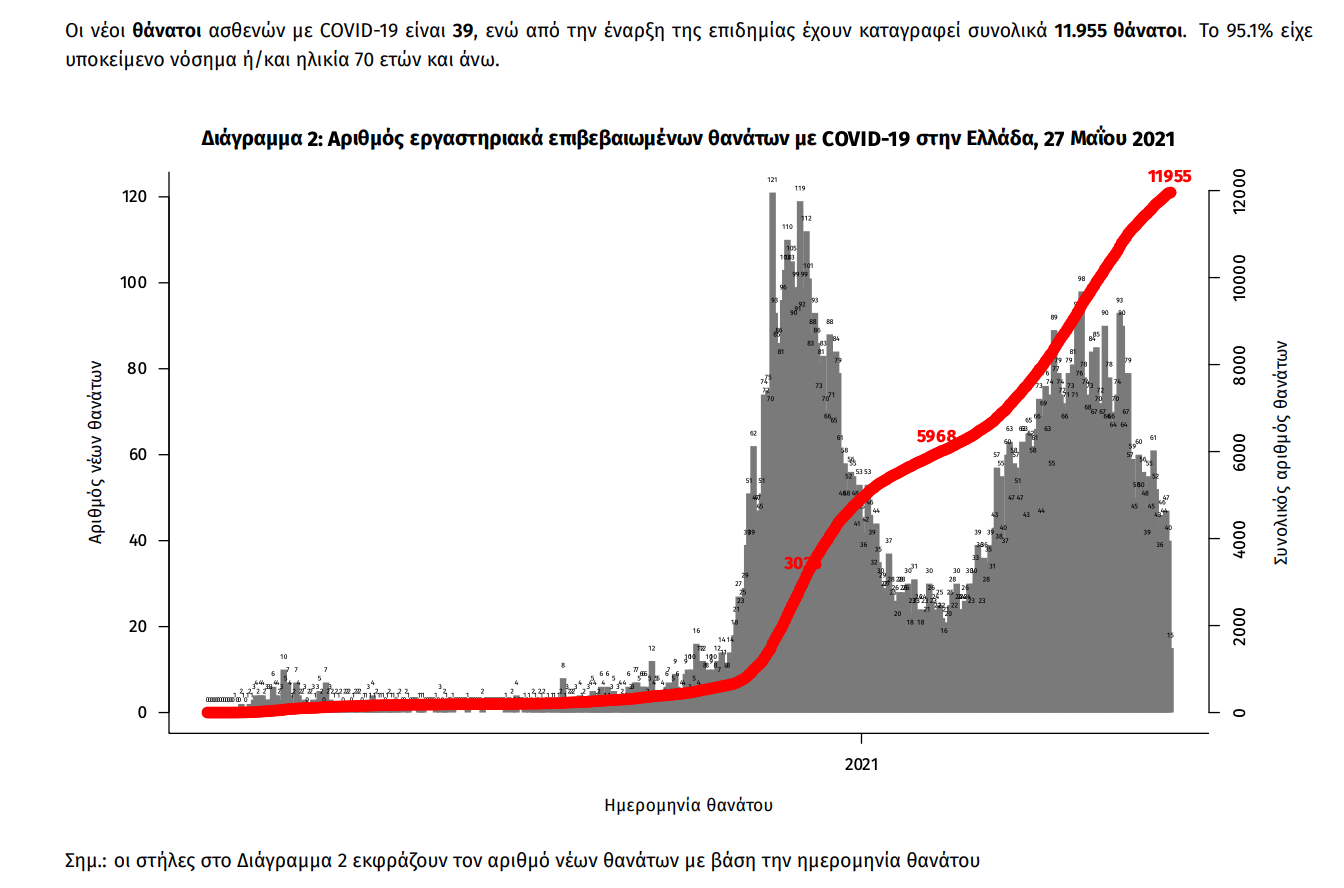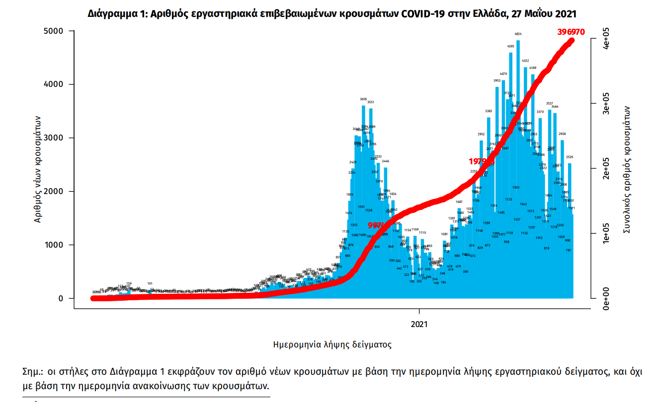 Τα στοιχεία που παρουσιάζονται αφορούν περιστατικά από την επιδημιολογική επιτήρηση της νόσου από το νέο κορωνοϊό (COVID19), με βάση τα δεδομένα που έχουν δηλωθεί στον ΕΟΔΥ και καταγραφεί μέχρι τις 27 Μαΐου 2021 (ώρα 15:00). Τα νέα εργαστηριακά επιβεβαιωμένα κρούσματα της νόσου που καταγράφηκαν τις τελευταίες 24 ώρες είναι 1.905, εκ των οποίων 3 εντοπίστηκαν κατόπιν ελέγχων στις πύλες εισόδου της χώρας.
