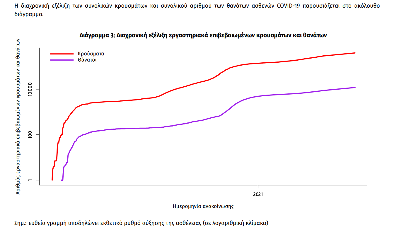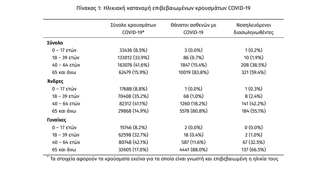 Ο αριθμός των ασθενών που νοσηλεύονται διασωληνωμένοι είναι 540 (62.4% άνδρες). Η διάμεση ηλικία τους είναι 67 έτη. To 85.2% έχει υποκείμενο νόσημα ή/και ηλικία 70 ετών και άνω. Από την αρχή της πανδημίας έχουν εξέλθει από τις ΜΕΘ 2.401 ασθενείς. Οι εισαγωγές2 νέων ασθενών Covid-19 στα νοσοκομεία της επικράτειας είναι 206 (ημερήσια μεταβολή -17.6%). Ο μέσος όρος εισαγωγών του επταημέρου είναι 231 ασθενείς.Η διάμεση ηλικία των κρουσμάτων είναι 44 έτη (εύρος 0.2 έως 106 έτη), ενώ η διάμεση ηλικία των θανόντων είναι 78 έτη (εύρος 0.2 έως 106 έτη).