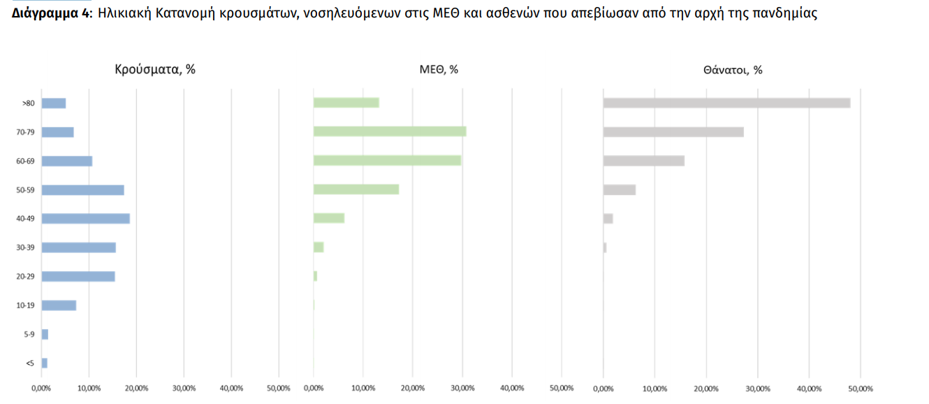 Ακολούθως παρουσιάζεται η ηλικιακή κατανομή των (α) συνολικών κρουσμάτων, (β) των περιστατικών που κατέληξαν σε θάνατο και (γ) των ασθενών που νοσηλεύονται διασωληνωμένοι: