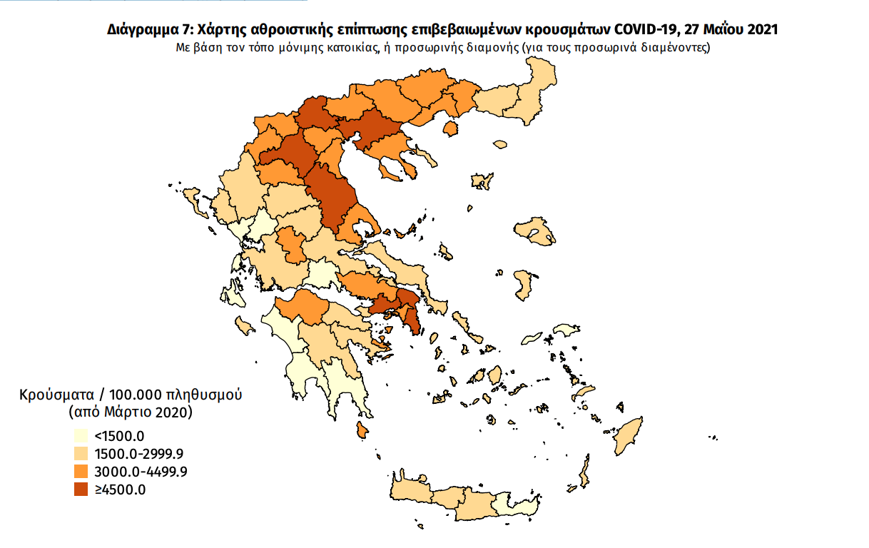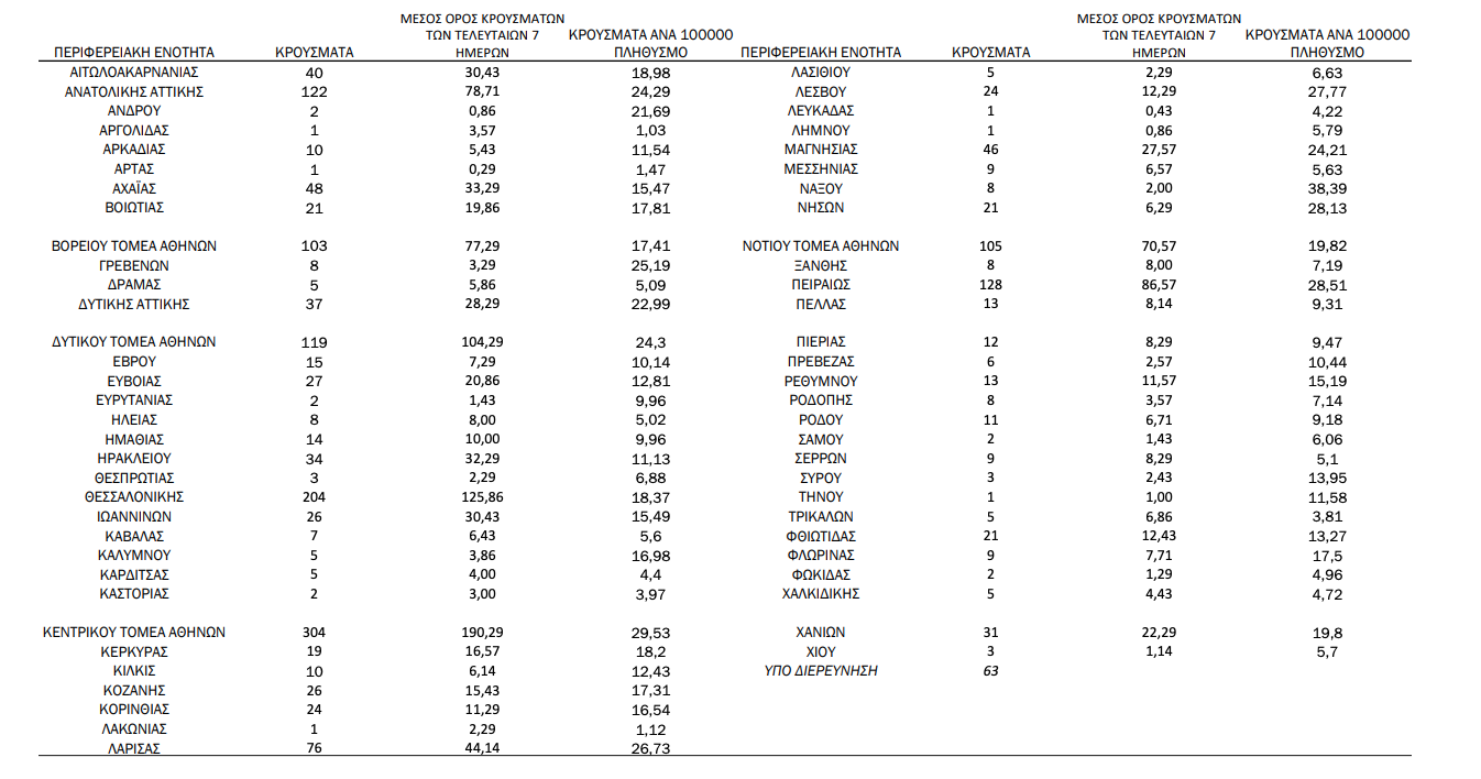Κατανομή ανακοινωθέντων εγχώριων κρουσμάτων: Από το σύνολο των 1.905 νέων κρουσμάτων του νέου ιού στη χώρα 3 είναι εισαγόμενα εκ των οποίων 3 εντοπίστηκαν κατόπιν ελέγχων στις πύλες εισόδου της χώρας. Η κατανομή των 1.902 νέων εγχώριων κρουσμάτων ανά Περιφερειακή Ενότητα παρουσιάζεται στον κατωτέρω πίνακα.3 Πίνακας 2: Ημερήσιος αριθμός και κρούσματα ανά 100.000 πληθυσμού επιβεβαιωμένων εγχώριων κρουσμάτων COVID-19 ανά περιφερειακή ενότητα στις 27 Μαΐου 2021