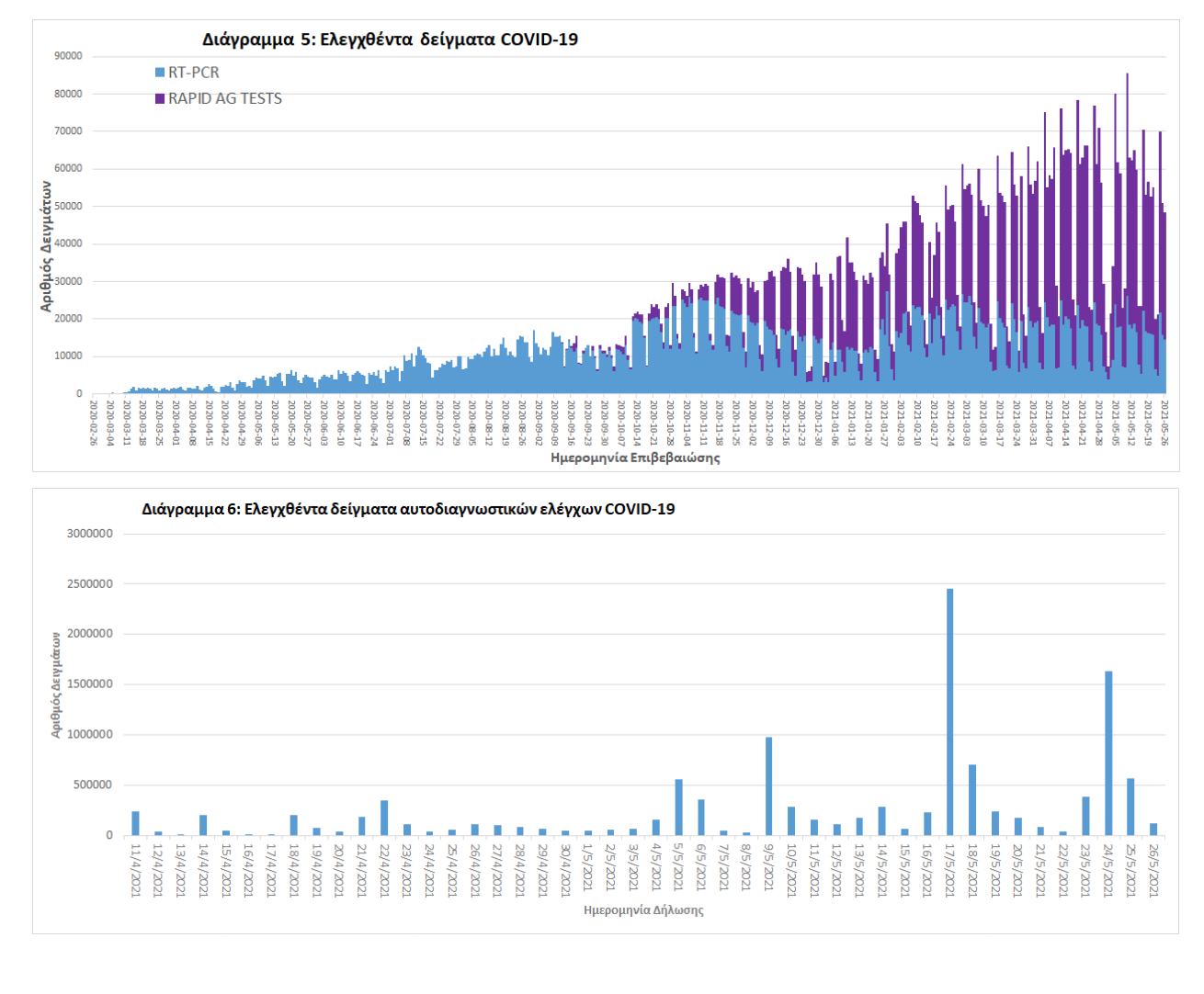 Δείγματα που έχουν ελεγχθεί: Από την 1η Ιανουαρίου 2020 μέχρι σήμερα, στα εργαστήρια που διενεργούν ελέγχους για τον νέο κορωνοϊό (SARS-CoV-2) και που δηλώνουν συστηματικά το σύνολο των δειγμάτων που ελέγχουν, έχουν συνολικά ελεγχθεί 5.029.262 κλινικά δείγματα ενώ από Μονάδες Υγείας και Κλιμάκια του ΕΟΔΥ που διενεργούν ελέγχους Rapid Ag έχουν ελεγχθεί 4.349.086 δείγματα. O μέσος όρος του επταημέρου είναι 45.517 δειγματοληπτικοί έλεγχοι. Αυτοδιαγνωστικοί έλεγχοι (Self-tests): Έως 26 Μαΐου 2021, έχουν καταγραφεί ηλεκτρονικά 11.925.156 δηλώσεις αποτελέσματος αυτοδιαγνωστικού ελέγχου, ενώ 230.556 άτομα προσήλθαν για επανέλεγχο. Mαζικές Δειγματοληψίες ΕΟΔΥ: Στις 26 Μαΐου 2021, πραγματοποιήθηκαν 138 δράσεις δειγματοληπτικών ελέγχων από τις Κινητές Ομάδες Υγείας (ΚΟΜΥ) του ΕΟΔΥ, στις οποίες διενεργήθηκαν 14.434 έλεγχοι Rapid Ag και ανευρέθηκαν 228 θετικά (1,58%).