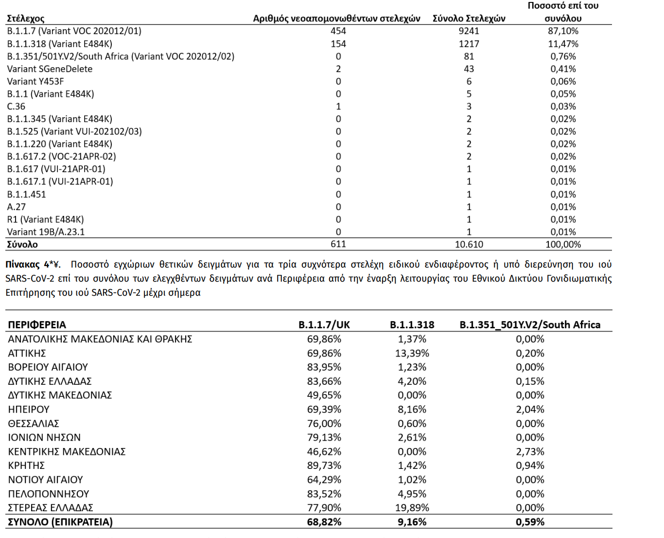 Eθνικό Δίκτυο Γονιδιωματικής Επιτήρησης ΕΟΔΥ για τις μεταλλάξεις του SARS-CoV-2 Ολοκληρώθηκε από το Eθνικό Δίκτυο Γονιδιωματικής Επιτήρησης του ιού SARS-CoV-2, που λειτουργεί υπό το συντονισμό του ΕΟΔΥ, η γονιδιωματική ανάλυση σε 632 επιλεγμένα δείγματα που αφορούν στην περίοδο 14 Απριλίου έως 16 Μαΐου 2021. Από τον έλεγχο των 632 δειγμάτων, αναδείχθηκαν συνολικά 454 δείγματα με στελέχη ειδικού ενδιαφέροντος (Variants Of Concern – VOC) και 154 δείγματα με στελέχη υπό διερεύνηση (Variants Under Investigation – VUI). Εκ των 454 δειγμάτων με στελέχη ειδικού ενδιαφέροντος, όλα αφορούν στο Β.1.1.7/UK lineage (Variant VOC 202012/01), ενώ τα 154 δείγματα με στελέχη VUI αφορούν στο B.1.1.318 (Variant E484K). Επιπλέον, αναδείχθηκαν 2 δείγματα με στέλεχος Variant S Gene Delete και 1 δείγμα με το στέλεχος C.36 (στέλεχος υπό παρακολούθηση, Variant Under Monitoring) (Πίνακας 3). Από την έναρξη λειτουργίας του Εθνικού Δικτύου Γονιδιωματικής Επιτήρησης του ιού SARS-CoV-2 μέχρι σήμερα έχουν ελεγχθεί στην επικράτεια συνολικά 13.289 δείγματα από εγχώρια κρούσματα, εκ των οποίων τα τρία πιο συχνά στελέχη ειδικού ενδιαφέροντος ή υπό διερεύνηση που έχουν απομονωθεί είναι το Β.1.1.7/UK lineage (Variant VOC 202012/01), με ποσοστό 68,82%, ακολουθούμενο από το B.1.1.318 (Variant E484K) με ποσοστό 9,16% και το B.1.351/501Y.V2/South Africa (Variant VOC 202012/02) με ποσοστό 0,59% (Πίνακας 4). Επιπλέον, έχουν απομονωθεί συνολικά 100 στελέχη ειδικού ενδιαφέροντος ή υπό διερεύνηση ή ενδιαφέροντος από δείγματα εισαγόμενων κρουσμάτων, εκ των οποίων 95 αφορούν στο Β.1.1.7/UK lineage (Variant VOC-202012/01), 3 στο B.1.351/501Y.V2/South Africa (Variant VOC-202012/02), 1 στο B.1.525 (Variant VUI-202102/03) και 1 στο Β.1.617.1 (VUI-21APR-01). Πίνακας 3*¥. Απόλυτη και σχετική συχνότητα στελεχών ειδικού ενδιαφέροντος/υπό διερεύνηση/υπό παρακολούθηση ή άλλα στελέχη ενδιαφέροντος του ιού SARS CoV-2 από την έναρξη λειτουργίας του Εθνικού Δικτύου Γονιδιωματικής Επιτήρησης του ιού SARS-CoV-2 μέχρι σήμερα