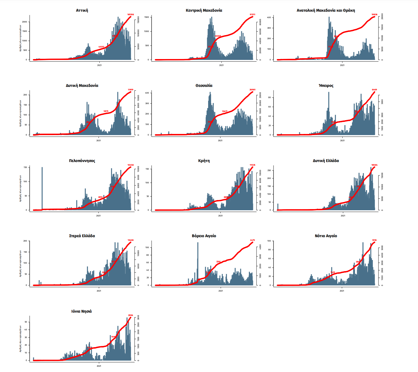 Παράρτημα 1: Επιδημικές καμπύλες κρουσμάτων COVID-19 με βάση την δηλωθείσα διεύθυνση μόνιμης κατοικίας του κρούσματος ή τη διεύθυνση προσωρινής διαμονής για τους τουρίστες και άλλους προσωρινά διαμένοντες στην Ελλάδα. Συμπεριλαμβάνονται τόσο κρούσματα με ιστορικό ταξιδίου όσο και κρούσματα με πιθανή εγχώρια μετάδοση.