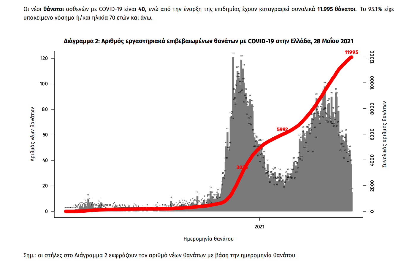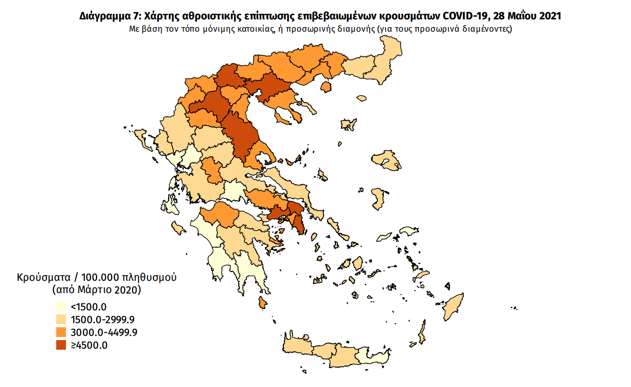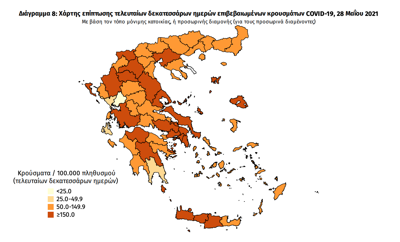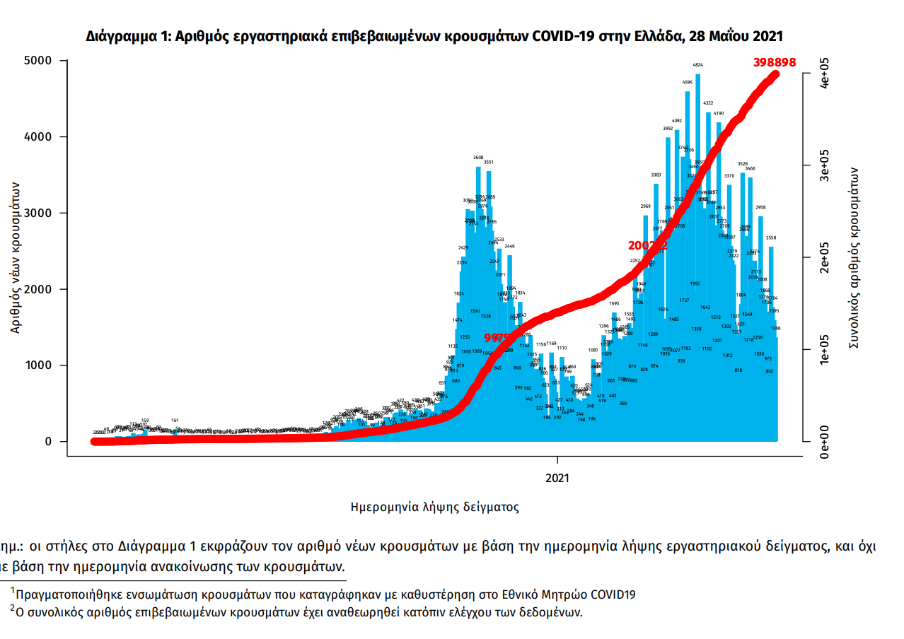 Τα στοιχεία που παρουσιάζονται αφορούν περιστατικά από την επιδημιολογική επιτήρηση της νόσου από το νέο κορωνοϊό (COVID19), με βάση τα δεδομένα που έχουν δηλωθεί στον ΕΟΔΥ και καταγραφεί μέχρι τις 28 Μαΐου 2021 (ώρα 15:00). Τα νέα εργαστηριακά επιβεβαιωμένα κρούσματα της νόσου που καταγράφηκαν τις τελευταίες 24 ώρες είναι 1.585, εκ των οποίων 6 εντοπίστηκαν κατόπιν ελέγχων στις πύλες εισόδου της χώρας.