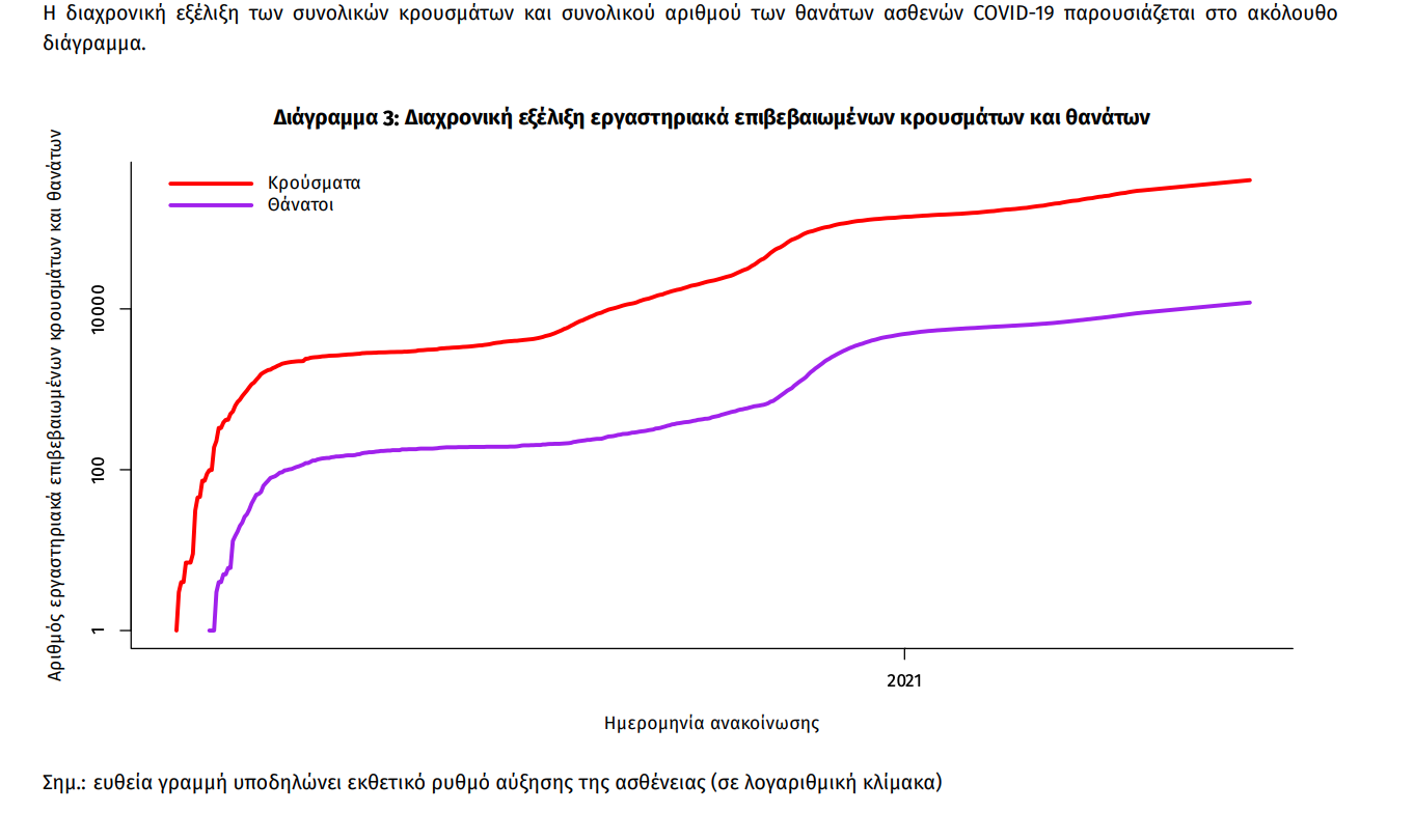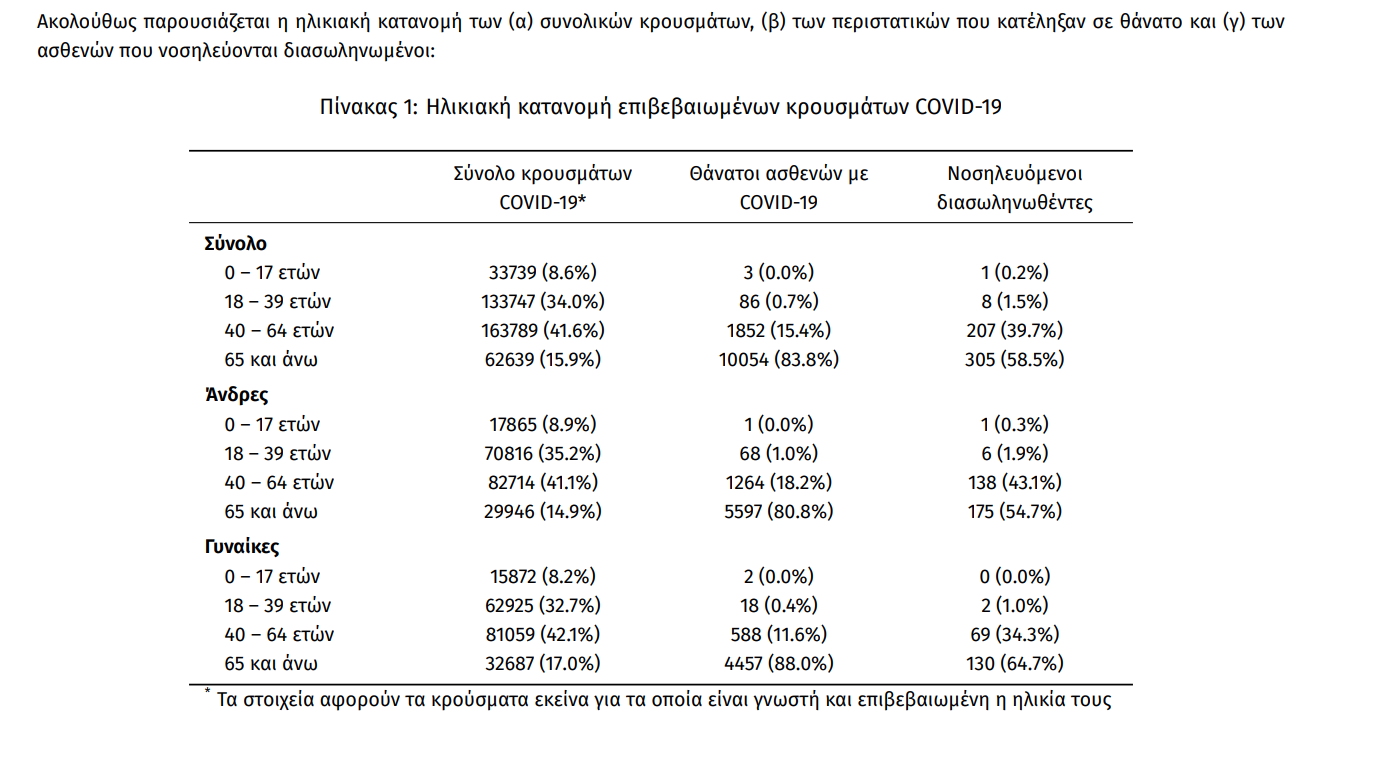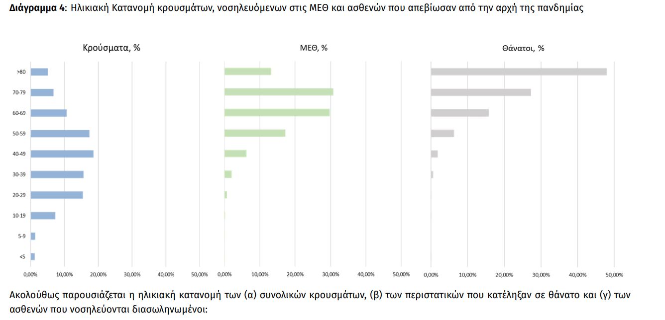 Ο αριθμός των ασθενών που νοσηλεύονται διασωληνωμένοι είναι 521 (61.8% άνδρες). Η διάμεση ηλικία τους είναι 67 έτη. To 85.6% έχει υποκείμενο νόσημα ή/και ηλικία 70 ετών και άνω. Από την αρχή της πανδημίας έχουν εξέλθει από τις ΜΕΘ 2.411 ασθενείς. Οι εισαγωγές3 νέων ασθενών Covid-19 στα νοσοκομεία της επικράτειας είναι 231 (ημερήσια μεταβολή +12.14%). Ο μέσος όρος εισαγωγών του επταημέρου είναι 227 ασθενείς.Η διάμεση ηλικία των κρουσμάτων είναι 44 έτη (εύρος 0.2 έως 106 έτη), ενώ η διάμεση ηλικία των θανόντων είναι 78 έτη (εύρος 0.2 έως 106 έτη).