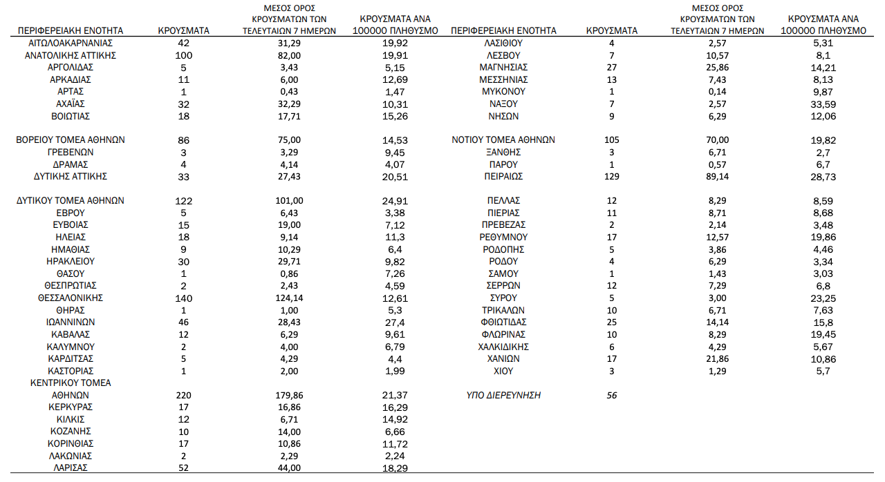 Κατανομή ανακοινωθέντων εγχώριων κρουσμάτων: Από το σύνολο των 1.585 νέων κρουσμάτων του νέου ιού στη χώρα 9 είναι εισαγόμενα εκ των οποίων 6 εντοπίστηκαν κατόπιν ελέγχων στις πύλες εισόδου της χώρας. Η κατανομή των 1.576 νέων εγχώριων κρουσμάτων ανά Περιφερειακή Ενότητα παρουσιάζεται στον κατωτέρω πίνακα.4 Πίνακας 2: Ημερήσιος αριθμός και κρούσματα ανά 100.000 πληθυσμού επιβεβαιωμένων εγχώριων κρουσμάτων COVID-19 ανά περιφερειακή ενότητα στις 28 Μαΐου 2021