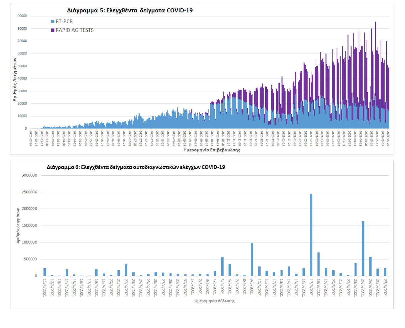 Δείγματα που έχουν ελεγχθεί: Από την 1η Ιανουαρίου 2020 μέχρι σήμερα, στα εργαστήρια που διενεργούν ελέγχους για τον νέο κορωνοϊό (SARS-CoV-2) και που δηλώνουν συστηματικά το σύνολο των δειγμάτων που ελέγχουν, έχουν συνολικά ελεγχθεί 5.043.871 κλινικά δείγματα ενώ από Μονάδες Υγείας και Κλιμάκια του ΕΟΔΥ που διενεργούν ελέγχους Rapid Ag έχουν ελεγχθεί 4.383.466 δείγματα. O μέσος όρος του επταημέρου είναι 44.987 δειγματοληπτικοί έλεγχοι. Αυτοδιαγνωστικοί έλεγχοι (Self-tests): Έως 27 Μαΐου 2021, έχουν καταγραφεί ηλεκτρονικά 12.266.667 δηλώσεις αποτελέσματος αυτοδιαγνωστικού ελέγχου, ενώ 243.003 άτομα προσήλθαν για επανέλεγχο. Mαζικές Δειγματοληψίες ΕΟΔΥ: Στις 27 Μαΐου 2021, πραγματοποιήθηκαν 138 δράσεις δειγματοληπτικών ελέγχων από τις Κινητές Ομάδες Υγείας (ΚΟΜΥ) του ΕΟΔΥ, στις οποίες διενεργήθηκαν 13.647 έλεγχοι Rapid Ag και ανευρέθηκαν 238 θετικά (1,74%).