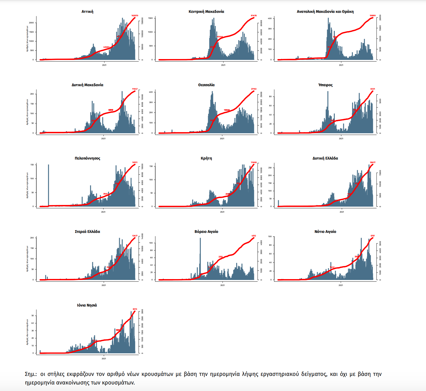 Παράρτημα 1: Επιδημικές καμπύλες κρουσμάτων COVID-19 με βάση την δηλωθείσα διεύθυνση μόνιμης κατοικίας του κρούσματος ή τη διεύθυνση προσωρινής διαμονής για τους τουρίστες και άλλους προσωρινά διαμένοντες στην Ελλάδα. Συμπεριλαμβάνονται τόσο κρούσματα με ιστορικό ταξιδίου όσο και κρούσματα με πιθανή εγχώρια μετάδοση.