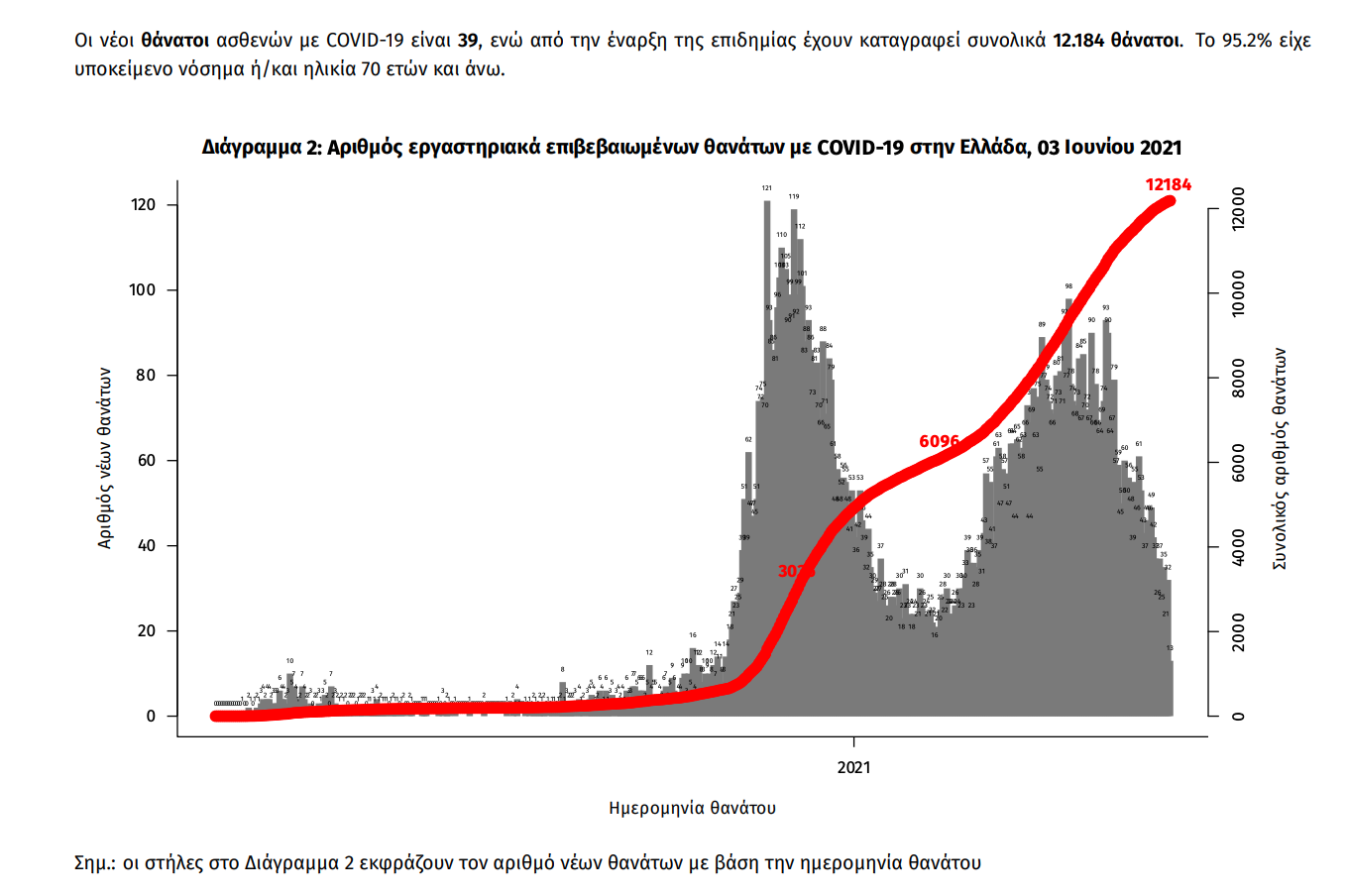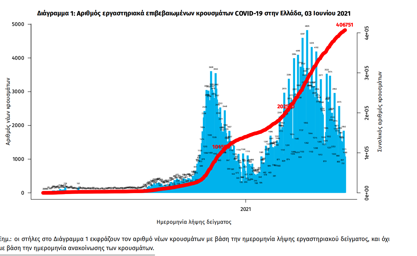 Τα στοιχεία που παρουσιάζονται αφορούν περιστατικά από την επιδημιολογική επιτήρηση της νόσου από το νέο κορωνοϊό (COVID19), με βάση τα δεδομένα που έχουν δηλωθεί στον ΕΟΔΥ και καταγραφεί μέχρι τις 03 Ιουνίου 2021 (ώρα 15:00). Τα νέα εργαστηριακά επιβεβαιωμένα κρούσματα της νόσου που καταγράφηκαν τις τελευταίες 24 ώρες είναι 1.239, εκ των οποίων 1 εντοπίστηκε κατόπιν ελέγχων στις πύλες εισόδου της χώρας.