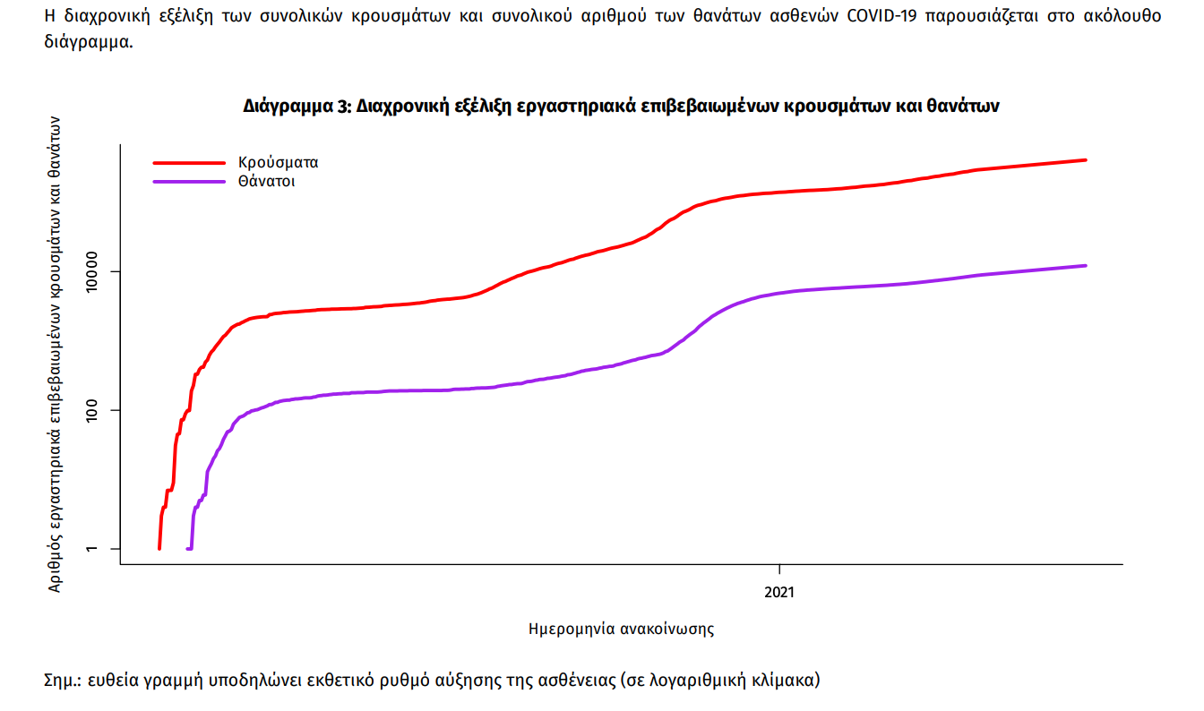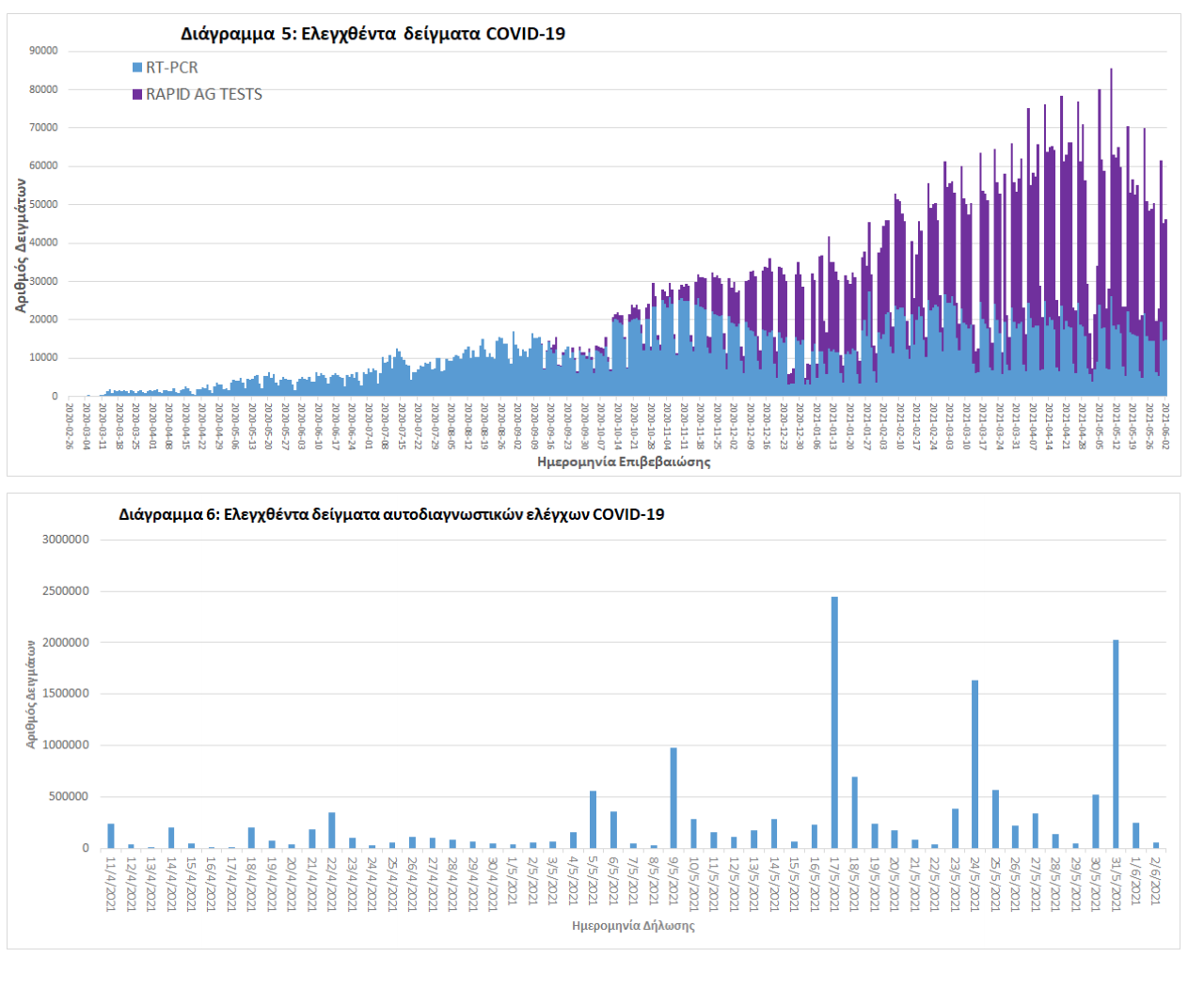 Δείγματα που έχουν ελεγχθεί: Από την 1η Ιανουαρίου 2020 μέχρι σήμερα, στα εργαστήρια που διενεργούν ελέγχους για τον νέο κορωνοϊό (SARS-CoV-2) και που δηλώνουν συστηματικά το σύνολο των δειγμάτων που ελέγχουν, έχουν συνολικά ελεγχθεί 5.118.682 κλινικά δείγματα ενώ από Μονάδες Υγείας και Κλιμάκια του ΕΟΔΥ που διενεργούν ελέγχους Rapid Ag έχουν ελεγχθεί 4.554.962 δείγματα. O μέσος όρος του επταημέρου είναι 42.185 δειγματοληπτικοί έλεγχοι. Αυτοδιαγνωστικοί έλεγχοι (Self-tests): Έως 02 Ιουνίου 2021, έχουν καταγραφεί ηλεκτρονικά 15.406.333 δηλώσεις αποτελέσματος αυτοδιαγνωστικού ελέγχου, ενώ 296.534 άτομα προσήλθαν για επανέλεγχο. Mαζικές Δειγματοληψίες ΕΟΔΥ: Στις 02 Ιουνίου 2021, πραγματοποιήθηκαν 130 δράσεις δειγματοληπτικών ελέγχων από τις Κινητές Ομάδες Υγείας (ΚΟΜΥ) του ΕΟΔΥ, στις οποίες διενεργήθηκαν 11.735 έλεγχοι Rapid Ag και ανευρέθηκαν 190 θετικά (1,62%).