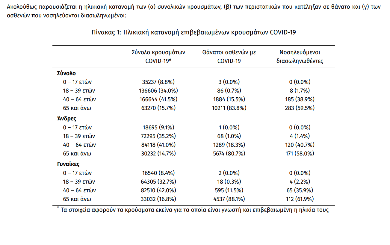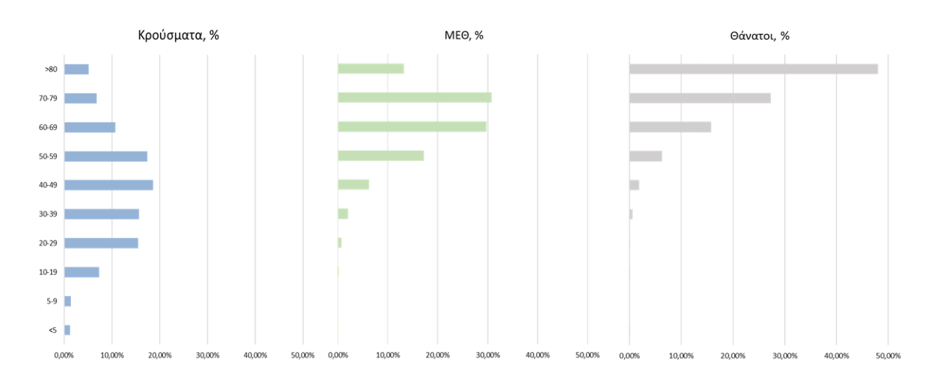 Ο αριθμός των ασθενών που νοσηλεύονται διασωληνωμένοι είναι 476 (61.9% άνδρες). Η διάμεση ηλικία τους είναι 67 έτη. To 87.0% έχει υποκείμενο νόσημα ή/και ηλικία 70 ετών και άνω. Από την αρχή της πανδημίας έχουν εξέλθει από τις ΜΕΘ 2.473 ασθενείς. Οι εισαγωγές2 νέων ασθενών Covid-19 στα νοσοκομεία της επικράτειας είναι 145 (ημερήσια μεταβολή -26.77%). Ο μέσος όρος εισαγωγών του επταημέρου είναι 186 ασθενείς.Η διάμεση ηλικία των κρουσμάτων είναι 43 έτη (εύρος 0.2 έως 106 έτη), ενώ η διάμεση ηλικία των θανόντων είναι 78 έτη (εύρος 0.2 έως 106 έτη). Διάγραμμα 4: Ηλικιακή Κατανομή κρουσμάτων, νοσηλευόμενων στις MEΘ και ασθενών που απεβίωσαν από την αρχή της πανδημίας