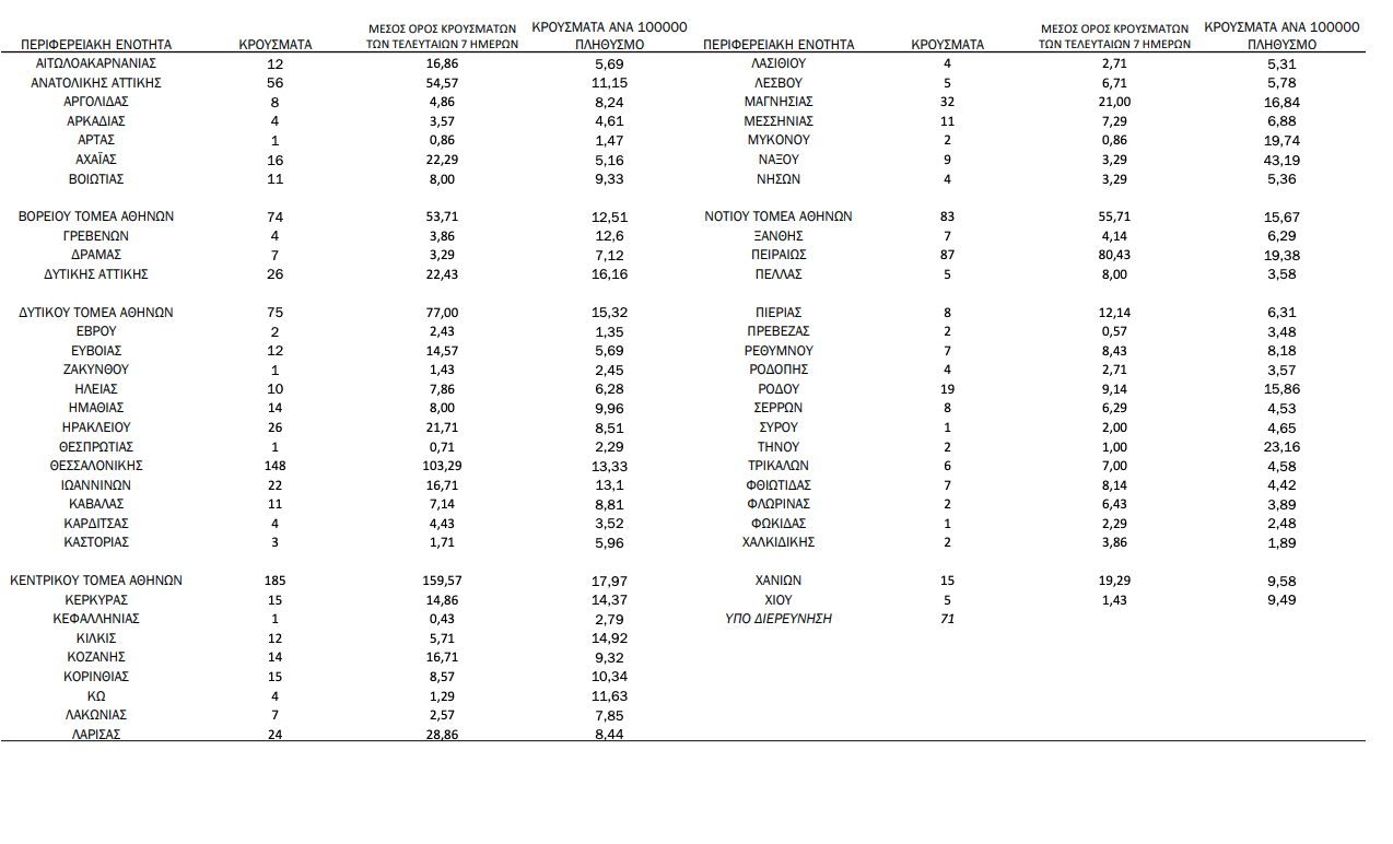 Κατανομή ανακοινωθέντων εγχώριων κρουσμάτων: Από το σύνολο των 1.239 νέων κρουσμάτων του νέου ιού στη χώρα 5 είναι εισαγόμενα εκ των οποίων 1 εντοπίστηκε κατόπιν ελέγχων στις πύλες εισόδου της χώρας. Η κατανομή των 1.234 νέων εγχώριων κρουσμάτων ανά Περιφερειακή Ενότητα παρουσιάζεται στον κατωτέρω πίνακα.3 Πίνακας 2: Ημερήσιος αριθμός και κρούσματα ανά 100.000 πληθυσμού επιβεβαιωμένων εγχώριων κρουσμάτων COVID-19 ανά περιφερειακή ενότητα στις 03 Ιουνίου 2021