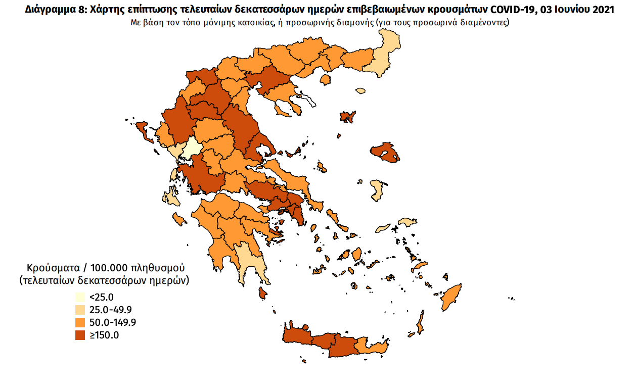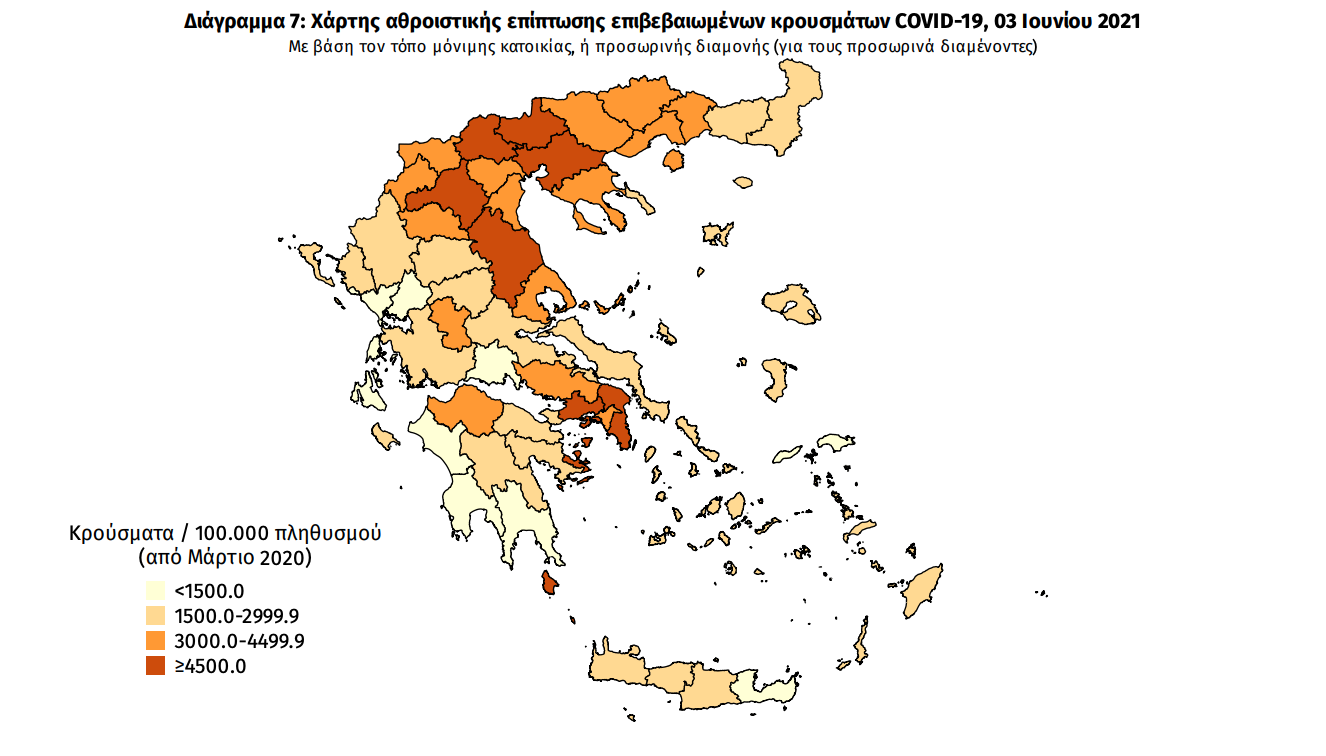 Γεωγραφική διασπορά: Ο χάρτης αποτυπώνει τη γεωγραφική κατανομή των συνολικών κρουσμάτων COVID-19 (από την αρχή της επιδημίας) ανά Περιφερειακή Ενότητα της χώρας, με βάση την δηλωθείσα διεύθυνση μόνιμης κατοικίας του ασθενούς, ή τη διεύθυνση προσωρινής διαμονής για τους τουρίστες και άλλους προσωρινά διαμένοντες στην Ελλάδα. Συμπεριλαμβάνονται τόσο κρούσματα με ιστορικό ταξιδίου (“εισαγόμενα”) όσο και κρούσματα με πιθανή εγχώρια μετάδοση.