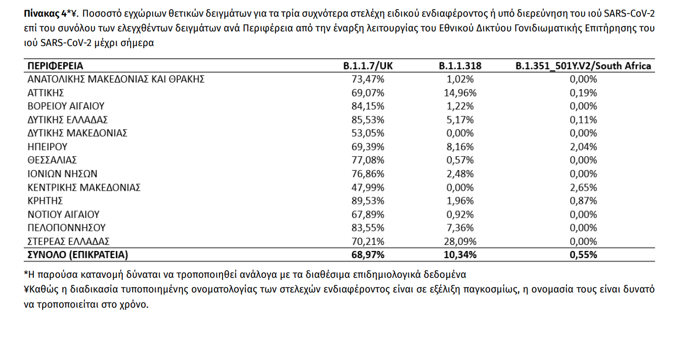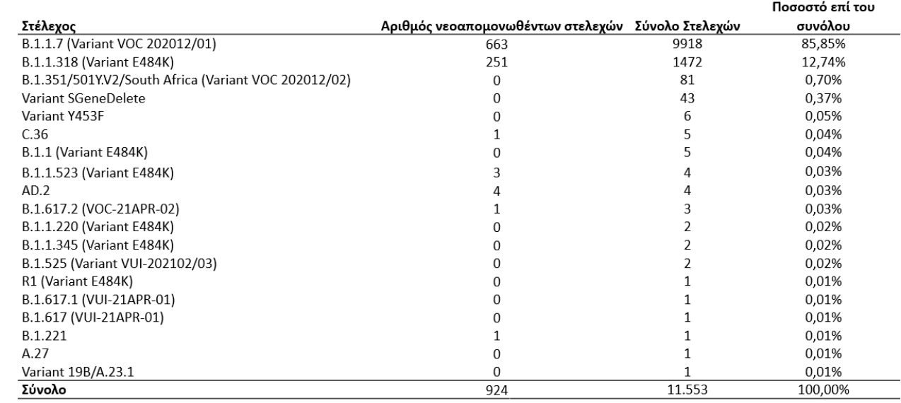 Eθνικό Δίκτυο Γονιδιωματικής Επιτήρησης ΕΟΔΥ για τις μεταλλάξεις του SARS-CoV-2 Ολοκληρώθηκε από το Eθνικό Δίκτυο Γονιδιωματικής Επιτήρησης του ιού SARS-CoV-2, που λειτουργεί υπό το συντονισμό του ΕΟΔΥ, η γονιδιωματική ανάλυση σε 955 επιλεγμένα δείγματα που αφορούν στην περίοδο 29 Μαρτίου έως 20 Μαΐου 2021. Από τον έλεγχο των 955 δειγμάτων, αναδείχθηκαν συνολικά 664 δείγματα με στελέχη ειδικού ενδιαφέροντος (Variants Of Concern – VOC) και 251 δείγματα με στελέχη υπό διερεύνηση (Variants Under Investigation – VUI). Εκ των 664 δειγμάτων με στελέχη ειδικού ενδιαφέροντος, τα 663 αφορούν στο Β.1.1.7/UK lineage (Variant VOC 202012/01) και 1 αφορά στο B.1.617.2 (VOC-21APR-02), ενώ τα 251 δείγματα με στελέχη VUI αφορούν στο B.1.1.318 (Variant E484K). Επιπλέον, αναδείχθηκαν 3 δείγματα με στέλεχος B.1.1.523 (Variant E484K), 4 δείγματα με στέλεχος AD.2, 1 δείγμα με στέλεχος Β.1.221 και 1 δείγμα με το στέλεχος C.36 (στέλεχος υπό παρακολούθηση, Variant Under Monitoring) (Πίνακας 3). Από την έναρξη λειτουργίας του Εθνικού Δικτύου Γονιδιωματικής Επιτήρησης του ιού SARS-CoV-2 μέχρι σήμερα έχουν ελεγχθεί στην επικράτεια συνολικά 14.240 δείγματα από εγχώρια κρούσματα, εκ των οποίων τα τρία πιο συχνά στελέχη ειδικού ενδιαφέροντος ή υπό διερεύνηση που έχουν απομονωθεί είναι το Β.1.1.7/UK lineage (Variant VOC 202012/01), με ποσοστό 68,97%, ακολουθούμενο από το B.1.1.318 (Variant E484K) με ποσοστό 10,34% και το B.1.351/501Y.V2/South Africa (Variant VOC 202012/02) με ποσοστό 0,55% (Πίνακας 4). Επιπλέον, έχουν απομονωθεί συνολικά 101 στελέχη ειδικού ενδιαφέροντος ή υπό διερεύνηση ή ενδιαφέροντος από δείγματα εισαγόμενων κρουσμάτων, εκ των οποίων 96 αφορούν στο Β.1.1.7/UK lineage (Variant VOC-202012/01), 3 στο B.1.351/501Y.V2/South Africa (Variant VOC202012/02), 1 στο B.1.525 (Variant VUI-202102/03) και 1 στο Β.1.617.1 (VUI-21APR-01). Πίνακας 3*¥. Απόλυτη και σχετική συχνότητα στελεχών ειδικού ενδιαφέροντος/υπό διερεύνηση/υπό παρακολούθηση ή άλλα στελέχη ενδιαφέροντος του ιού SARS CoV-2 από την έναρξη λειτουργίας του Εθνικού Δικτύου Γονιδιωματικής Επιτήρησης του ιού SARS-CoV-2 μέχρι σήμερα