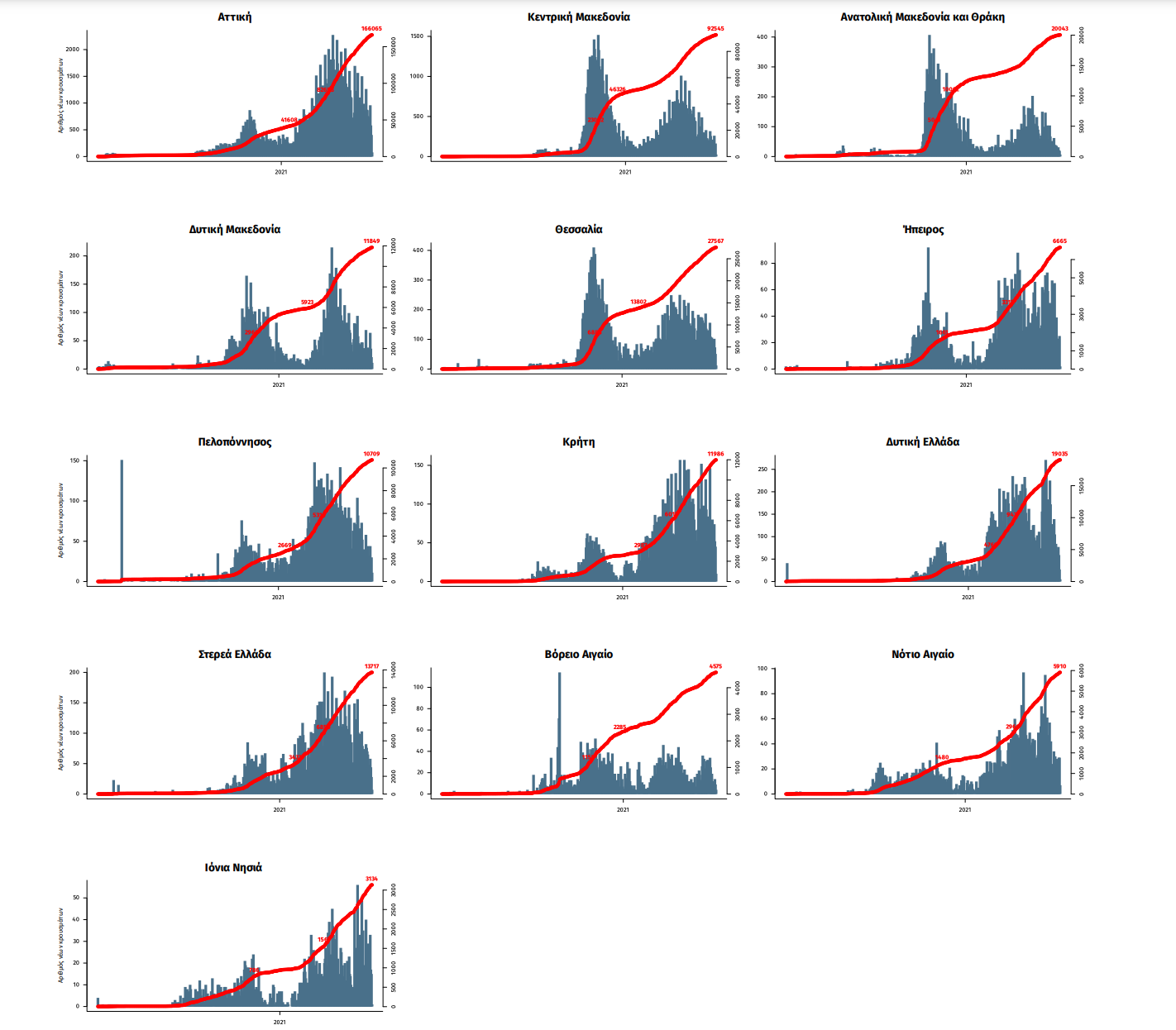 Παράρτημα 1: Επιδημικές καμπύλες κρουσμάτων COVID-19 με βάση την δηλωθείσα διεύθυνση μόνιμης κατοικίας του κρούσματος ή τη διεύθυνση προσωρινής διαμονής για τους τουρίστες και άλλους προσωρινά διαμένοντες στην Ελλάδα. Συμπεριλαμβάνονται τόσο κρούσματα με ιστορικό ταξιδίου όσο και κρούσματα με πιθανή εγχώρια μετάδοση.