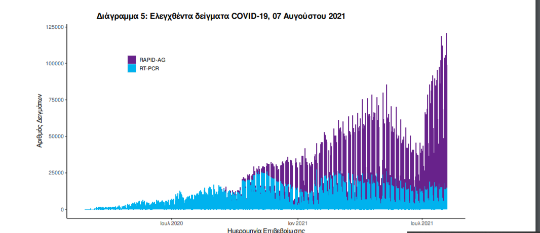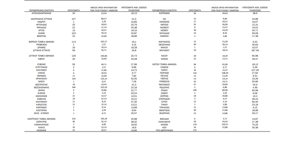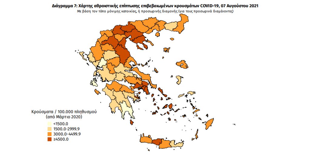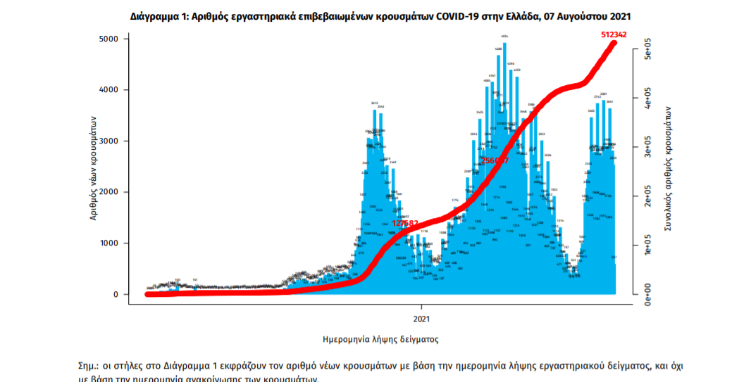 Τα νέα εργαστηριακά επιβεβαιωμένα κρούσματα της νόσου που καταγράφηκαν τις τελευταίες 24 ώρες είναι 2.768 , εκ των οποίων 7 εντοπίστηκαν κατόπιν ελέγχων στις πύλες εισόδου της χώρας. Ο συνολικός αριθμός των κρουσμάτων ανέρχεται σε 512.342 (ημερήσια μεταβολή +0.5%), εκ των οποίων 51.2% άνδρες. 1 Με βάση τα επιβεβαιωμένα κρούσματα των τελευταίων 7 ημερών, 129 θεωρούνται σχετιζόμενα με ταξίδι από το εξωτερικό και 2.185 είναι σχετιζόμενα με ήδη γνωστό κρούσμα