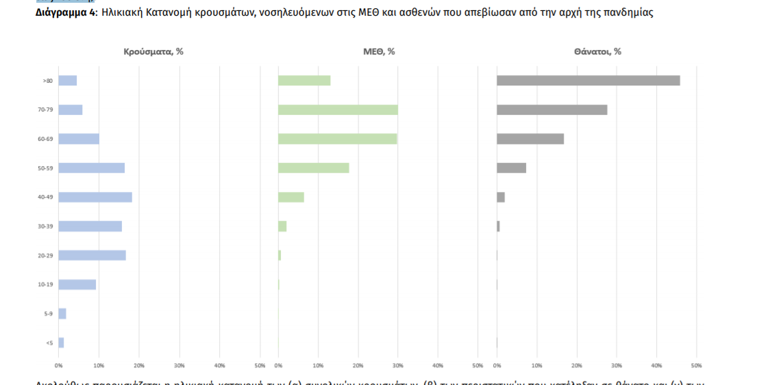 Ο αριθμός των ασθενών που νοσηλεύονται διασωληνωμένοι είναι 172 (64.0% άνδρες). Η διάμεση ηλικία τους είναι 65 έτη. To 82.6% έχει υποκείμενο νόσημα ή/και ηλικία 70 ετών και άνω. Από την αρχή της πανδημίας έχουν εξέλθει από τις ΜΕΘ 2.808 ασθενείς. Οι εισαγωγές2 νέων ασθενών Covid-19 στα νοσοκομεία της επικράτειας είναι 151 (ημερήσια μεταβολή -27.05%). Ο μέσος όρος εισαγωγών του επταημέρου είναι 172 ασθενείς.Η διάμεση ηλικία των κρουσμάτων είναι 41 έτη (εύρος 0.2 έως 106 έτη), ενώ η διάμεση ηλικία των θανόντων είναι 78 έτη (εύρος 0.2 έως 106 έτη)
