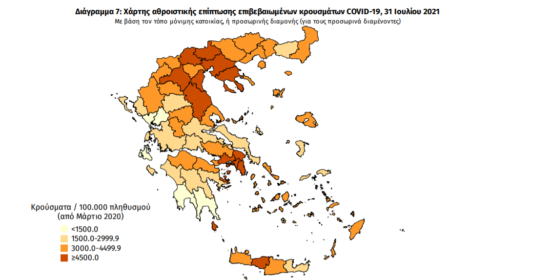 Τα νέα εργαστηριακά επιβεβαιωμένα κρούσματα της νόσου που καταγράφηκαν τις τελευταίες 24 ώρες είναι 2.760 , εκ των οποίων 12 εντοπίστηκαν κατόπιν ελέγχων στις πύλες εισόδου της χώρας. Ο συνολικός αριθμός των κρουσμάτων ανέρχεται σε 493.304 (ημερήσια μεταβολή +0.6%), εκ των οποίων 51.2% άνδρες. 1 Με βάση τα επιβεβαιωμένα κρούσματα των τελευταίων 7 ημερών, 138 θεωρούνται σχετιζόμενα με ταξίδι από το εξωτερικό και 1.865 είναι σχετιζόμενα με ήδη γνωστό κρούσμα.