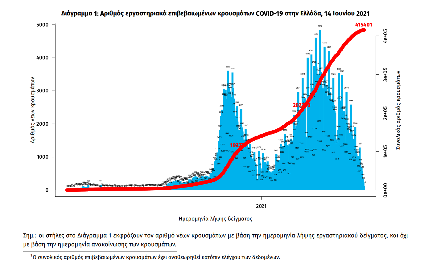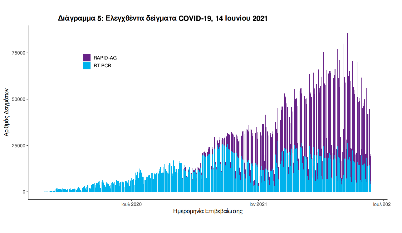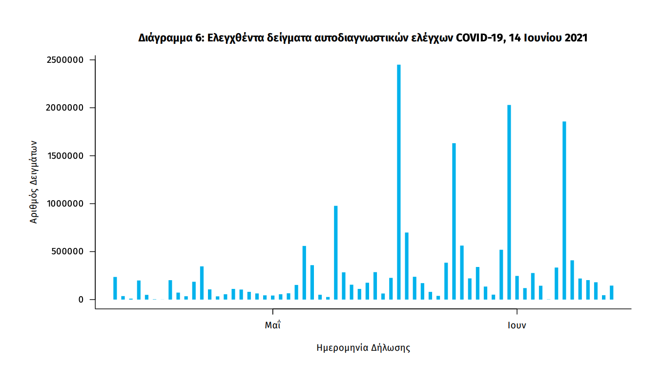 Δείγματα που έχουν ελεγχθεί: Από την 1η Ιανουαρίου 2020 μέχρι σήμερα, στα εργαστήρια που διενεργούν ελέγχους για τον νέο κορωνοϊό (SARS-CoV-2) και που δηλώνουν συστηματικά το σύνολο των δειγμάτων που ελέγχουν, έχουν συνολικά ελεγχθεί 5.243.601 κλινικά δείγματα ενώ από Μονάδες Υγείας και Κλιμάκια του ΕΟΔΥ που διενεργούν ελέγχους Rapid Ag έχουν ελεγχθεί 4.835.409 δείγματα. O μέσος όρος του επταημέρου είναι 38.077 δειγματοληπτικοί έλεγχοι. Αυτοδιαγνωστικοί έλεγχοι (Self-tests): Έως 13 Ιουνίου 2021, έχουν καταγραφεί ηλεκτρονικά 19.287.402 δηλώσεις αποτελέσματος αυτοδιαγνωστικού ελέγχου, ενώ 374.449 άτομα προσήλθαν για επανέλεγχο. Mαζικές Δειγματοληψίες ΕΟΔΥ: Στις 13 Ιουνίου 2021, πραγματοποιήθηκαν 43 δράσεις δειγματοληπτικών ελέγχων από τις Κινητές Ομάδες Υγείας (ΚΟΜΥ) του ΕΟΔΥ, στις οποίες διενεργήθηκαν 6.626 έλεγχοι Rapid Ag και ανευρέθηκαν 47 θετικά (0,71%).