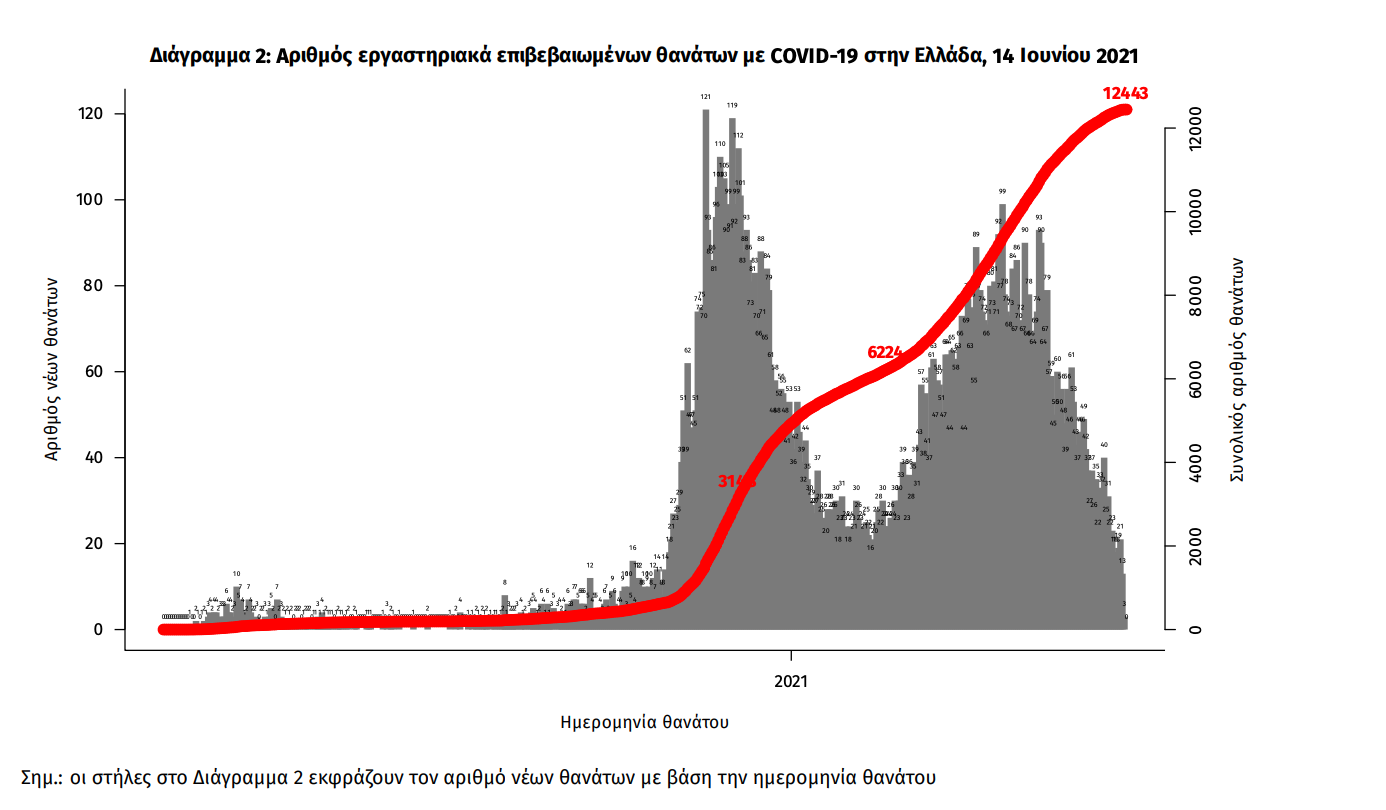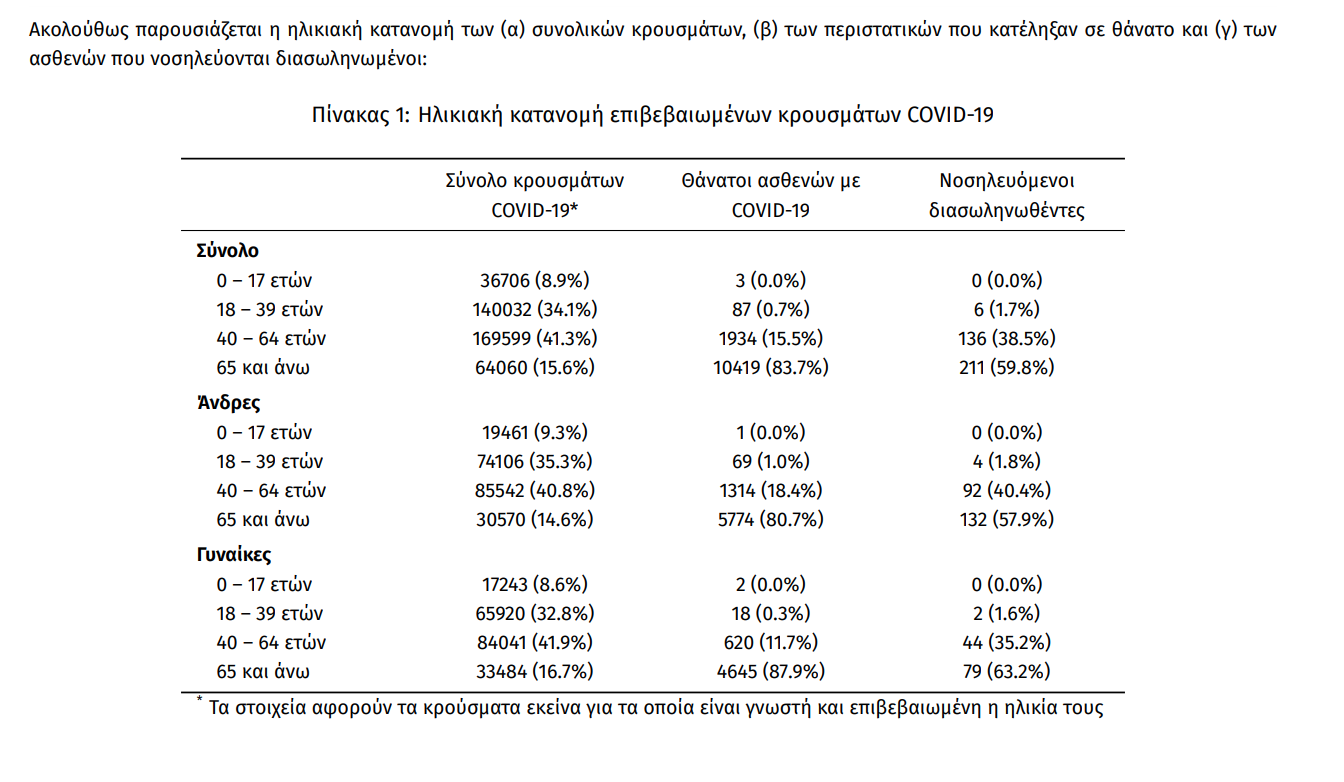 Οι νέοι θάνατοι ασθενών με COVID-19 είναι 18, ενώ από την έναρξη της επιδημίας έχουν καταγραφεί συνολικά 12.443 θάνατοι. Το 95.2% είχε υποκείμενο νόσημα ή/και ηλικία 70 ετών και άνω. Ο αριθμός των ασθενών που νοσηλεύονται διασωληνωμένοι είναι 353 (64.5% άνδρες). Η διάμεση ηλικία τους είναι 67 έτη. To 87.3% έχει υποκείμενο νόσημα ή/και ηλικία 70 ετών και άνω. Από την αρχή της πανδημίας έχουν εξέλθει από τις ΜΕΘ 2.563 ασθενείς.