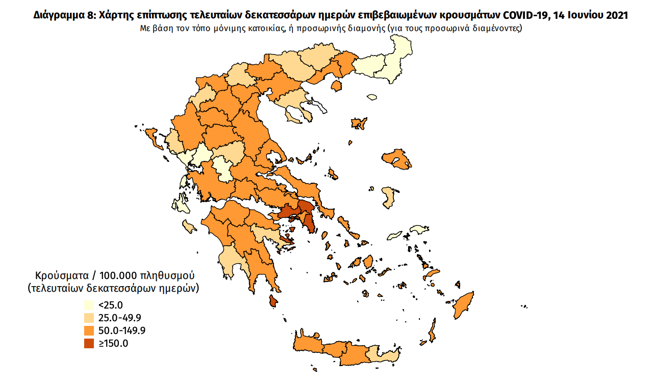 Κατανομή ανακοινωθέντων εγχώριων κρουσμάτων: Από το σύνολο των 472 νέων κρουσμάτων του νέου ιού στη χώρα 6 είναι εισαγόμενα εκ των οποίων 3 εντοπίστηκαν κατόπιν ελέγχων στις πύλες εισόδου της χώρας Η κατανομή των 466 νέων εγχώριων κρουσμάτων ανά Περιφερειακή Ενότητα παρουσιάζεται στον κατωτέρω πίνακα.4 Πίνακας 2: Ημερήσιος αριθμός και κρούσματα ανά 100.000 πληθυσμού επιβεβαιωμένων εγχώριων κρουσμάτων COVID-19 ανά περιφερειακή ενότητα στις 14 Ιουνίου 2021