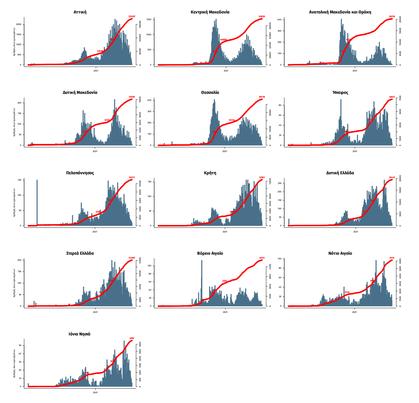 Παράρτημα 1: Επιδημικές καμπύλες κρουσμάτων COVID-19 με βάση την δηλωθείσα διεύθυνση μόνιμης κατοικίας του κρούσματος ή τη διεύθυνση προσωρινής διαμονής για τους τουρίστες και άλλους προσωρινά διαμένοντες στην Ελλάδα. Συμπεριλαμβάνονται τόσο κρούσματα με ιστορικό ταξιδίου όσο και κρούσματα με πιθανή εγχώρια μετάδοση.