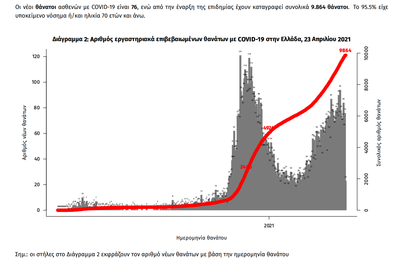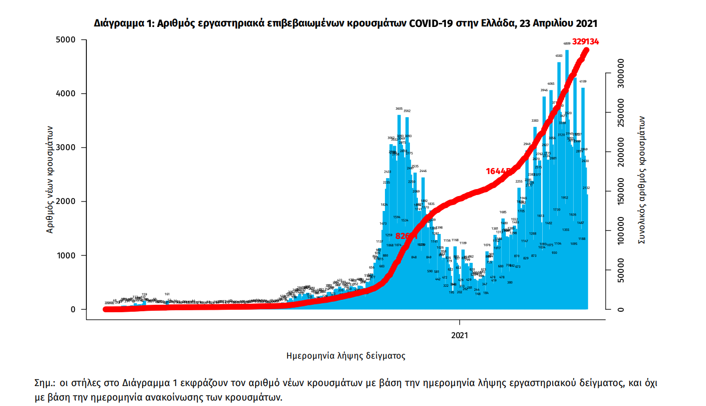 Τα στοιχεία που παρουσιάζονται αφορούν περιστατικά από την επιδημιολογική επιτήρηση της νόσου από το νέο κορωνοϊό (COVID19), με βάση τα δεδομένα που έχουν δηλωθεί στον ΕΟΔΥ και καταγραφεί μέχρι τις 23 Απριλίου 2021 (ώρα 15:00). Τα νέα εργαστηριακά επιβεβαιωμένα κρούσματα της νόσου που καταγράφηκαν τις τελευταίες 24 ώρες είναι 2.754, εκ των οποίων 12 εντοπίστηκαν κατόπιν ελέγχων στις πύλες εισόδου της χώρας.