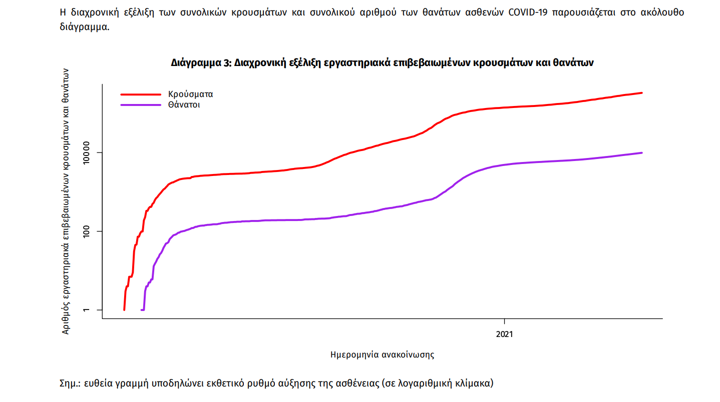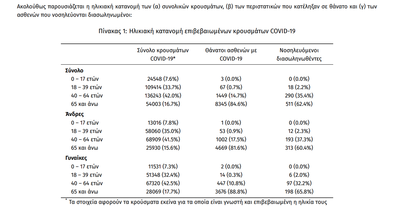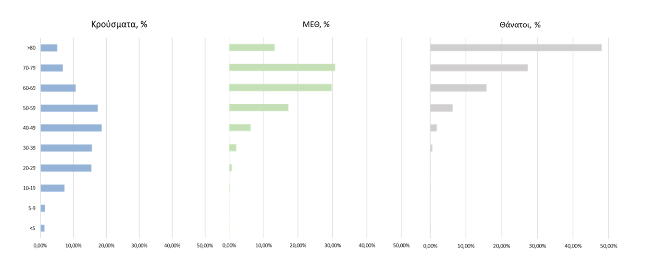 Ο αριθμός των ασθενών που νοσηλεύονται διασωληνωμένοι είναι 819 (63.2% άνδρες). Η διάμεση ηλικία τους είναι 68 έτη. To 84.5% έχει υποκείμενο νόσημα ή/και ηλικία 70 ετών και άνω. Από την αρχή της πανδημίας έχουν εξέλθει από τις ΜΕΘ 2.003 ασθενείς. Οι εισαγωγές2 νέων ασθενών Covid-19 στα νοσοκομεία της επικράτειας είναι 456 (ημερήσια μεταβολή -2.56%). Ο μέσος όρος εισαγωγών του επταημέρου είναι 479 ασθενείς.Η διάμεση ηλικία των κρουσμάτων είναι 44 έτη (εύρος 0.2 έως 106 έτη), ενώ η διάμεση ηλικία των θανόντων είναι 79 έτη (εύρος 0.2 έως 106 έτη). Διάγραμμα 4: Ηλικιακή Κατανομή κρουσμάτων, νοσηλευόμενων στις MEΘ και ασθενών που απεβίωσαν από την αρχή της πανδημίας