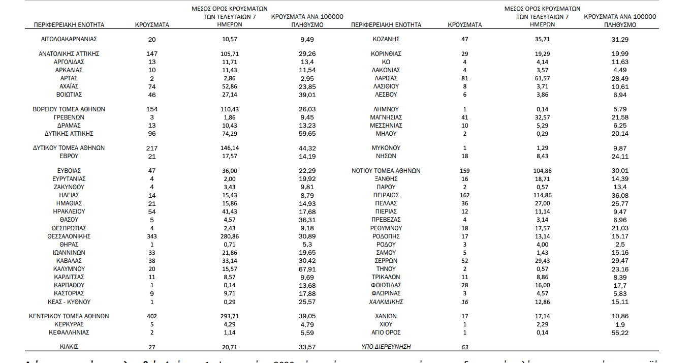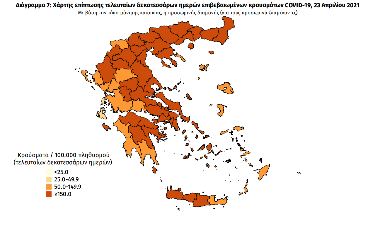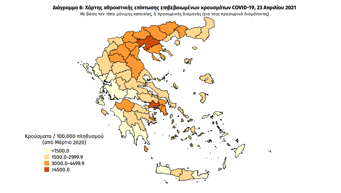 Γεωγραφική διασπορά: Ο χάρτης αποτυπώνει τη γεωγραφική κατανομή των συνολικών κρουσμάτων COVID-19 (από την αρχή της επιδημίας) ανά Περιφερειακή Ενότητα της χώρας, με βάση την δηλωθείσα διεύθυνση μόνιμης κατοικίας του ασθενούς, ή τη διεύθυνση προσωρινής διαμονής για τους τουρίστες και άλλους προσωρινά διαμένοντες στην Ελλάδα. Συμπεριλαμβάνονται τόσο κρούσματα με ιστορικό ταξιδίου (“εισαγόμενα”) όσο και κρούσματα με πιθανή εγχώρια μετάδοση