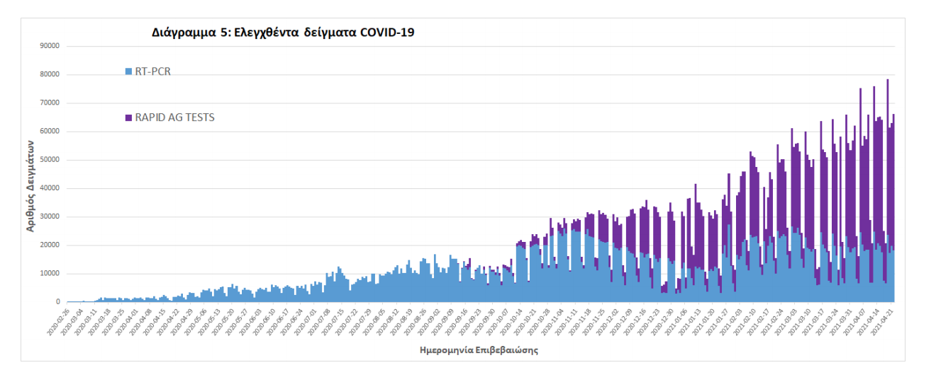 Δείγματα που έχουν ελεγχθεί: Από την 1η Ιανουαρίου 2020 μέχρι σήμερα, στα εργαστήρια που διενεργούν ελέγχους για τον νέο κορωνοϊό (SARS-CoV-2) και που δηλώνουν συστηματικά το σύνολο των δειγμάτων που ελέγχουν, έχουν συνολικά ελεγχθεί 4.551.139 κλινικά δείγματα ενώ από Μονάδες Υγείας και Κλιμάκια του ΕΟΔΥ που διενεργούν ελέγχους Rapid Ag έχουν ελεγχθεί 3.207.678 δείγματα. O μέσος όρος του επταημέρου είναι 54.194 δειγματοληπτικοί έλεγχοι ημερησίως. Mαζικές Δειγματοληψίες ΕΟΔΥ: Στις 22 Απριλίου 2021, πραγματοποιήθηκαν 125 δράσεις δειγματοληπτικών ελέγχων από τις Κινητές Ομάδες Υγείας (ΚΟΜΥ) του ΕΟΔΥ, στις οποίες διενεργήθηκαν 19.793 έλεγχοι Rapid Ag και ανευρέθηκαν 267 θετικά (1,35%).