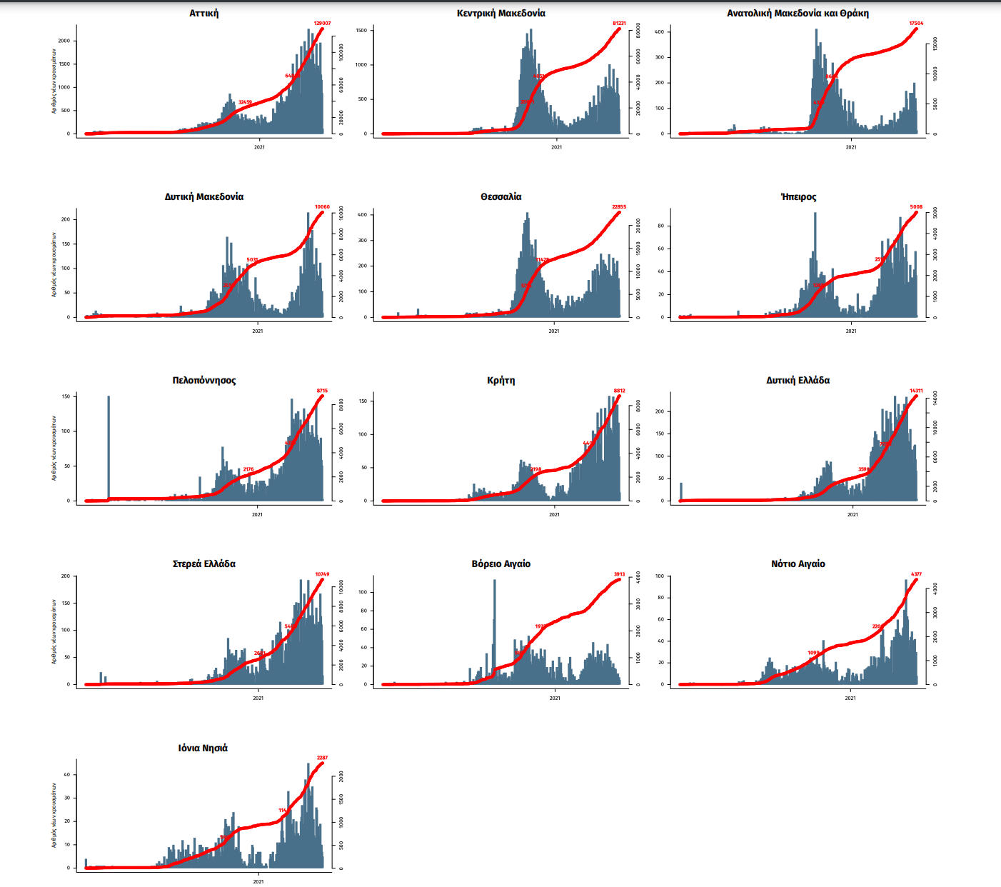 Παράρτημα 1: Επιδημικές καμπύλες κρουσμάτων COVID-19 με βάση την δηλωθείσα διεύθυνση μόνιμης κατοικίας του κρούσματος ή τη διεύθυνση προσωρινής διαμονής για τους τουρίστες και άλλους προσωρινά διαμένοντες στην Ελλάδα. Συμπεριλαμβάνονται τόσο κρούσματα με ιστορικό ταξιδίου όσο και κρούσματα με πιθανή εγχώρια μετάδοση.