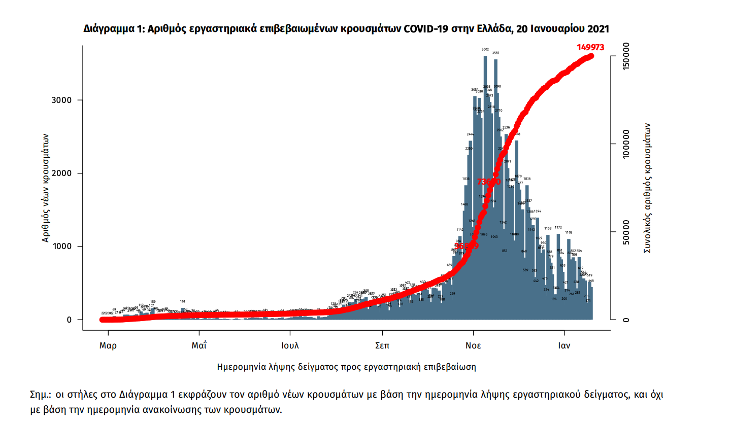 Τα στοιχεία που παρουσιάζονται αφορούν περιστατικά από την επιδημιολογική επιτήρηση της νόσου από το νέο κορωνοϊό (COVID19), με βάση τα δεδομένα που έχουν δηλωθεί στον ΕΟΔΥ και καταγραφεί μέχρι τις 20 Ιανουαρίου 2021 (ώρα 15:00). Τα νέα εργαστηριακά επιβεβαιωμένα κρούσματα της νόσου είναι 516, εκ των οποίων 16 εντοπίστηκαν κατόπιν ελέγχων στις πύλες εισόδου της χώρας. Ο συνολικός αριθμός των κρουσμάτων ανέρχεται σε 149973 (ημερήσια μεταβολή +0.3%), εκ των οποίων 52.1% άνδρες.