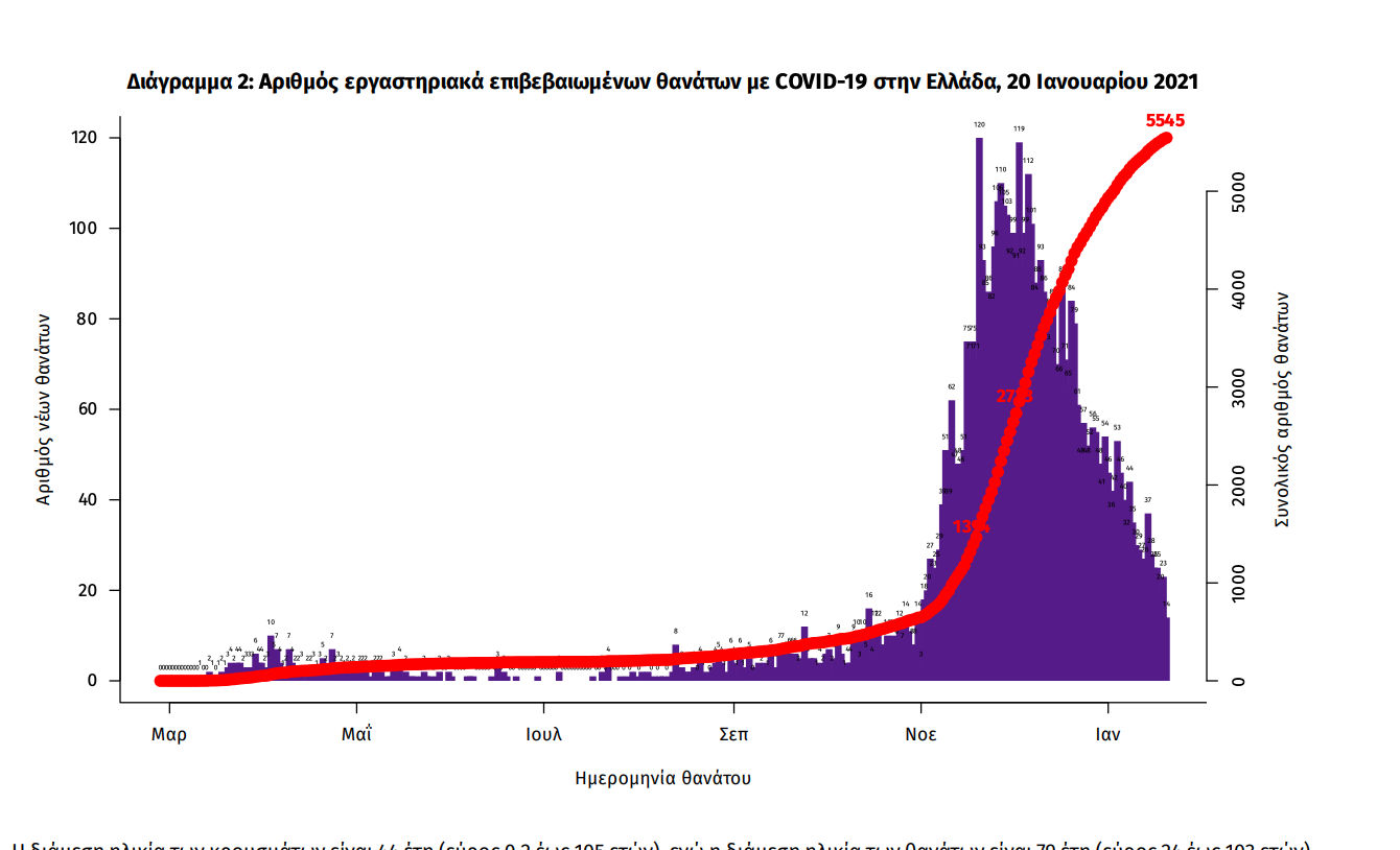 Τέλος, έχουμε 27 νέους θανάτους από τη νόσο COVID-19, φθάνοντας τους 5545 θανάτους συνολικά στη χώρα, εκ των οποίων 3271 (59.0%) άνδρες. Η διάμεση ηλικία των θανόντων συμπολιτών μας ήταν τα 79 έτη και το 95.4% είχε κάποιο υποκείμενο νόσημα ή/και ηλικία 70 ετών και άνω.