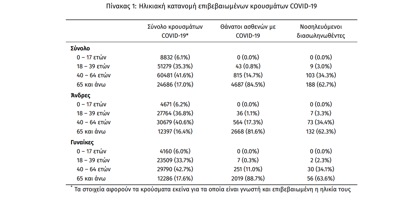Η διάμεση ηλικία των κρουσμάτων είναι 44 έτη (εύρος 0.2 έως 105 ετών), ενώ η διάμεση ηλικία των θανάτων είναι 79 έτη (εύρος 24 έως 103 ετών). Η ηλικιακή κατανομή των (α) συνολικών κρουσμάτων, (β) των περιστατικών που κατέληξαν σε θάνατο και (γ) των ασθενών που νοσηλεύονται διασωληνωμένοι, είναι η ακόλουθη:
