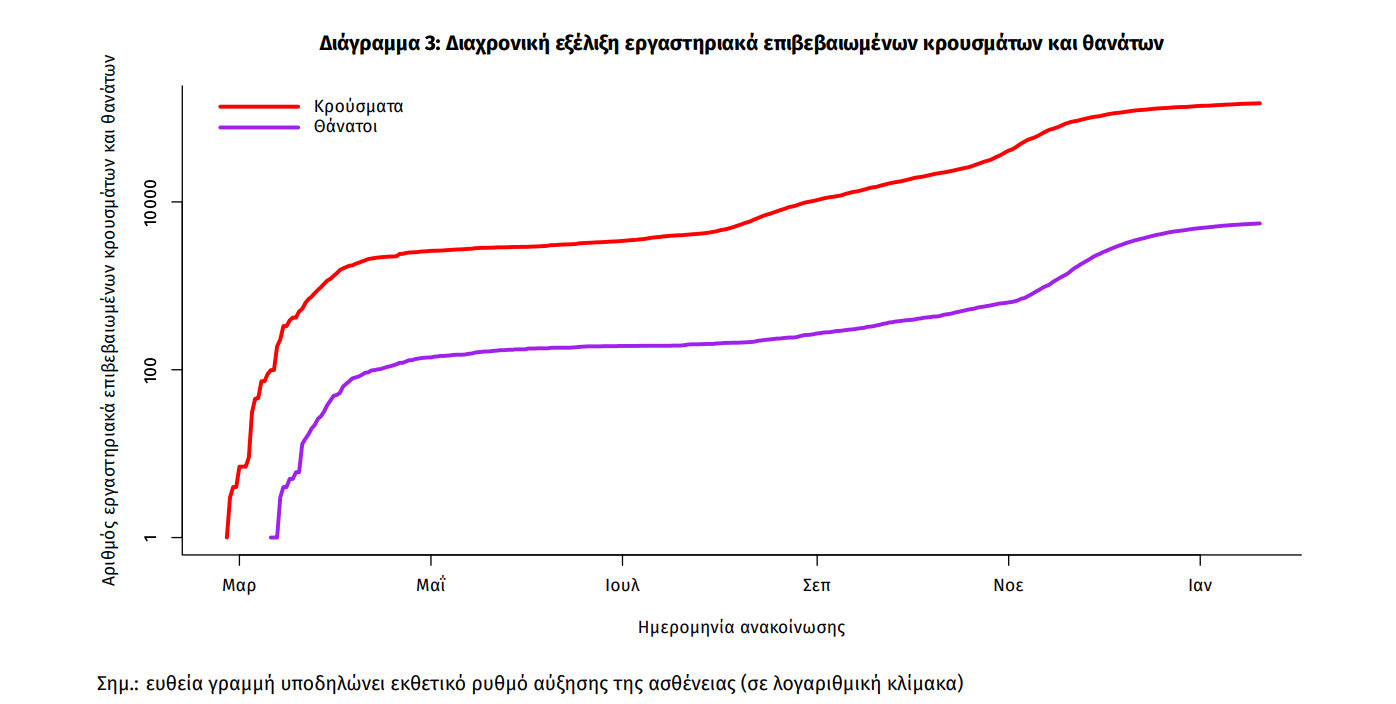 Η διαχρονική εξέλιξη των συνολικών κρουσμάτων και συνολικού αριθμού των θανάτων ασθενών COVID-19 παρουσιάζεται στο ακόλουθο διάγραμμα