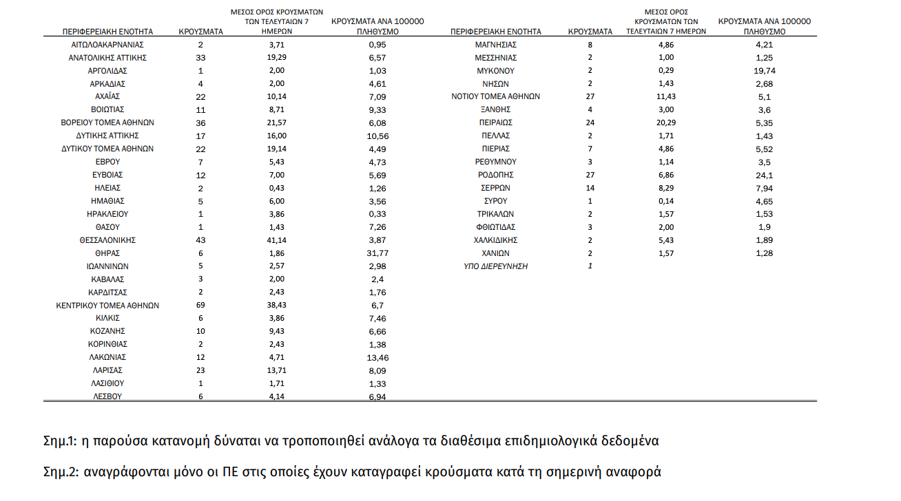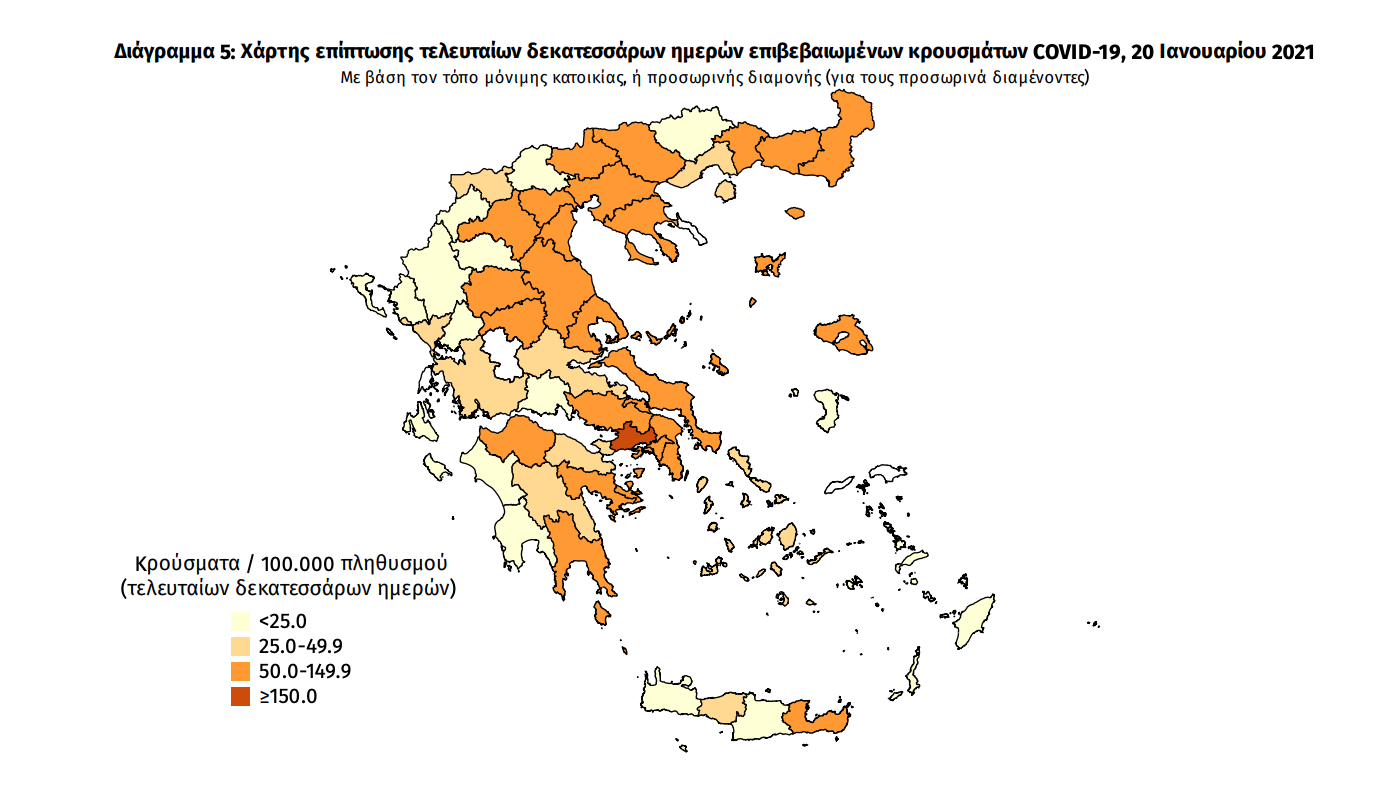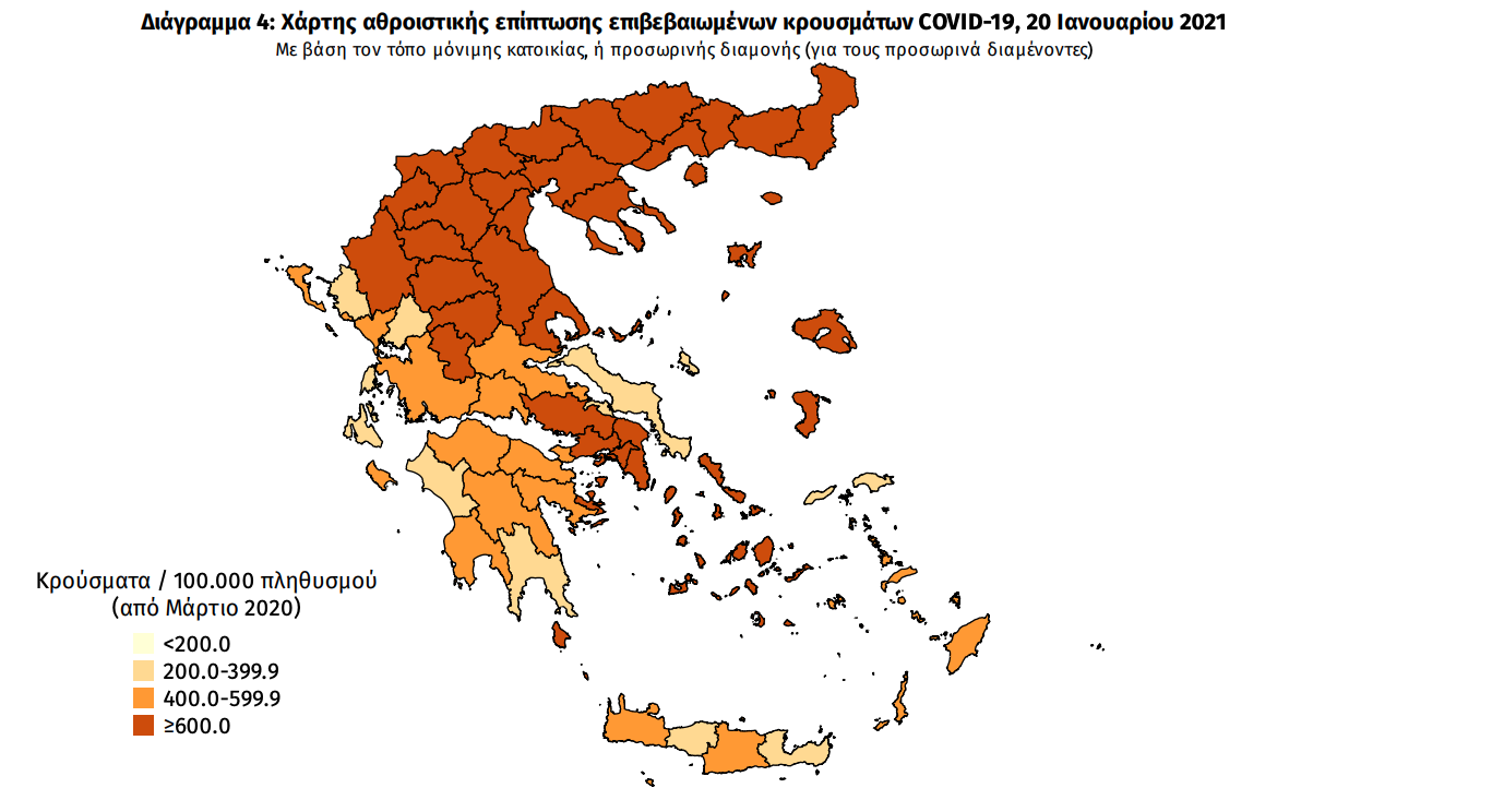 Γεωγραφική διασπορά Ο χάρτης αποτυπώνει τη γεωγραφική κατανομή των συνολικών κρουσμάτων COVID-19 (από την αρχή της επιδημίας) ανά Περιφερειακή Ενότητα της χώρας, με βάση την δηλωθείσα διεύθυνση μόνιμης κατοικίας του ασθενούς, ή τη διεύθυνση προσωρινής διαμονής για τους τουρίστες και άλλους προσωρινά διαμένοντες στην Ελλάδα. Συμπεριλαμβάνονται τόσο κρούσματα με ιστορικό ταξιδίου (“εισαγόμενα”) όσο και κρούσματα με πιθανή εγχώρια μετάδοση.