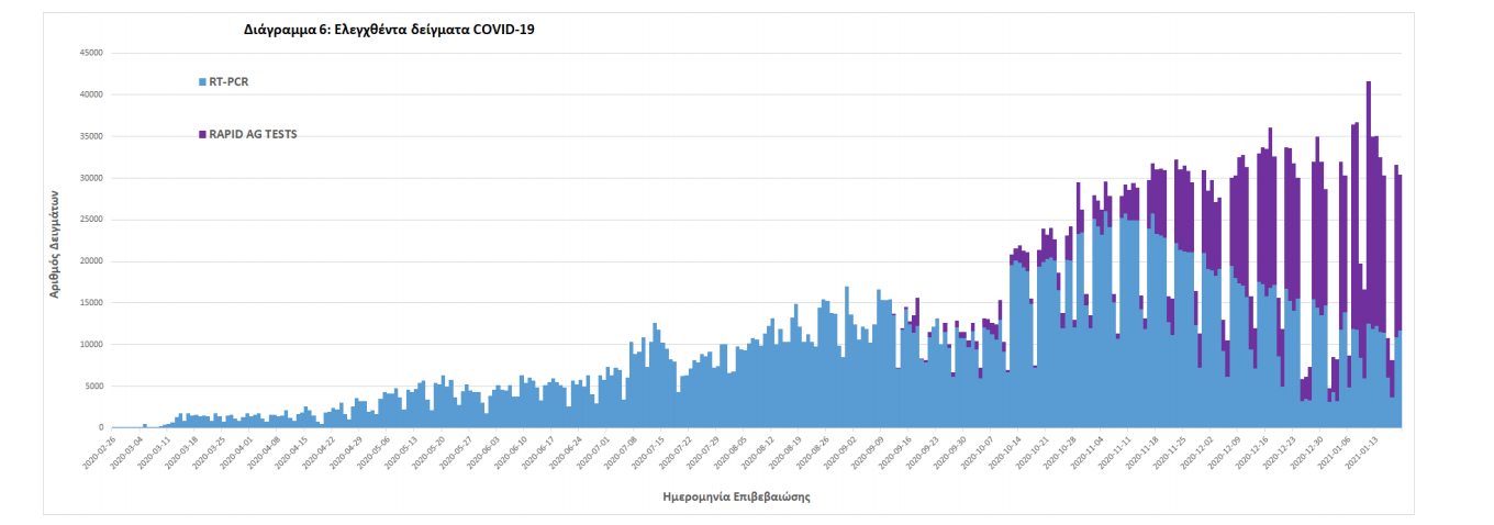 Δείγματα που έχουν ελεγχθεί: Από την 1η Ιανουαρίου 2020 μέχρι σήμερα, στα εργαστήρια που διενεργούν ελέγχους για τον νέο κορωνοϊό (SARS-CoV-2) και που δηλώνουν συστηματικά στον ΕΟΔΥ το σύνολο των δειγμάτων που ελέγχουν, έχουν συνολικά ελεγχθεί 2.989.339 κλινικά δείγματα ενώ από Μονάδες Υγείας και Κλιμάκια του ΕΟΔΥ που διενεργούν ελέγχους Rapid Ag έχουν ελεγχθεί 879.400 δείγματα.