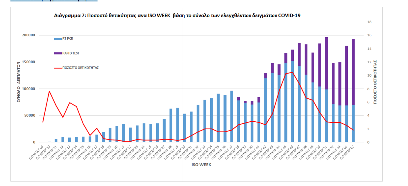 Την εβδομάδα 11 – 17 Ιανουαρίου (Iso Week 02) το ποσοστό θετικότητας ήταν 1,81% σε σύνολο 69.521 RT-PCR και 123.981 Rapid Ag τεστ που πραγματοποιήθηκαν