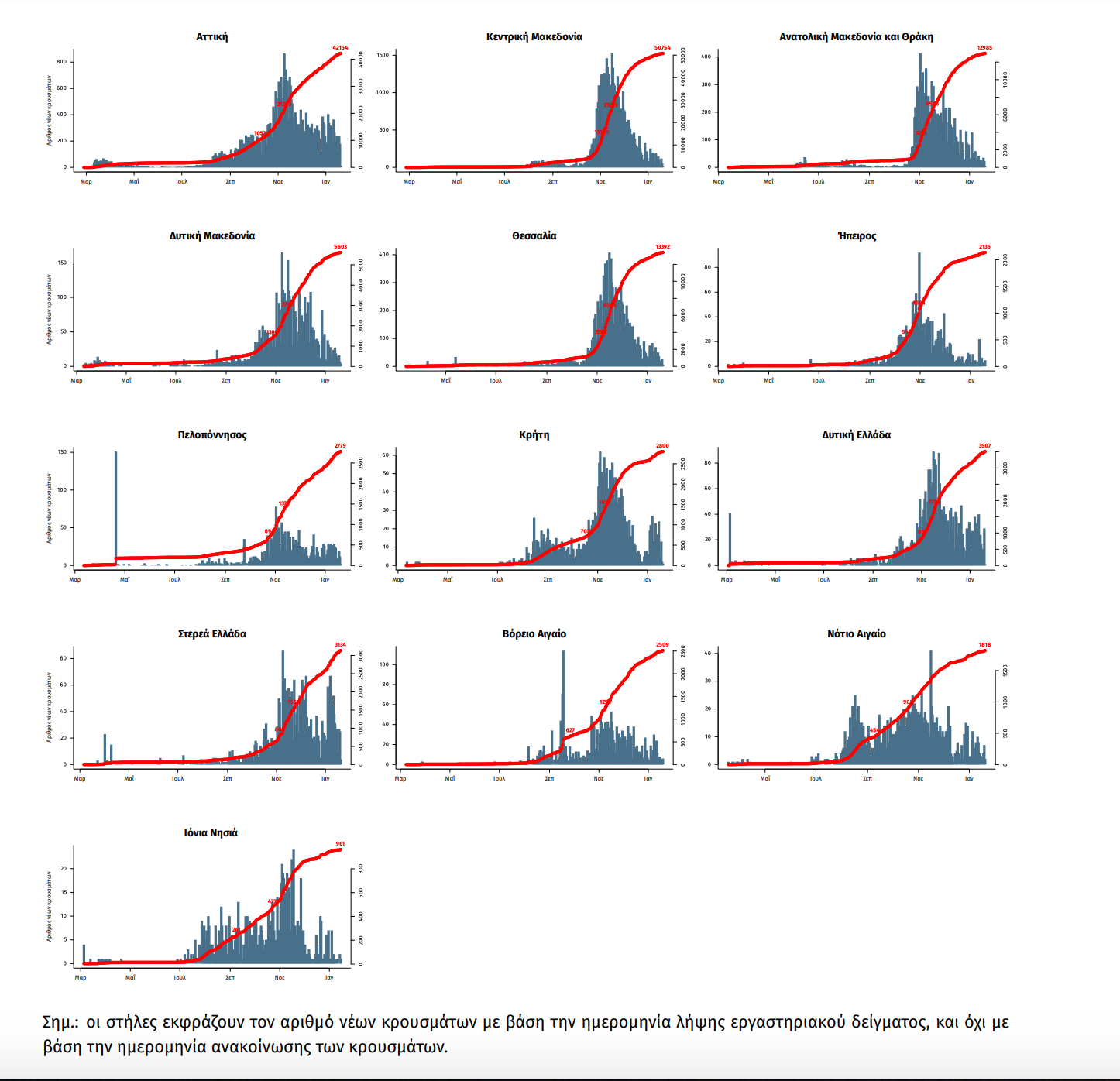 Παράρτημα 1: Επιδημικές καμπύλες κρουσμάτων COVID-19 ανά Περιφέρεια με βάση την δηλωθείσα διεύθυνση μόνιμης κατοικίας του κρούσματος ή τη διεύθυνση προσωρινής διαμονής για τους τουρίστες και άλλους προσωρινά διαμένοντες στην Ελλάδα. Συμπεριλαμβάνονται τόσο κρούσματα με ιστορικό ταξιδίου όσο και κρούσματα με πιθανή εγχώρια μετάδοση.