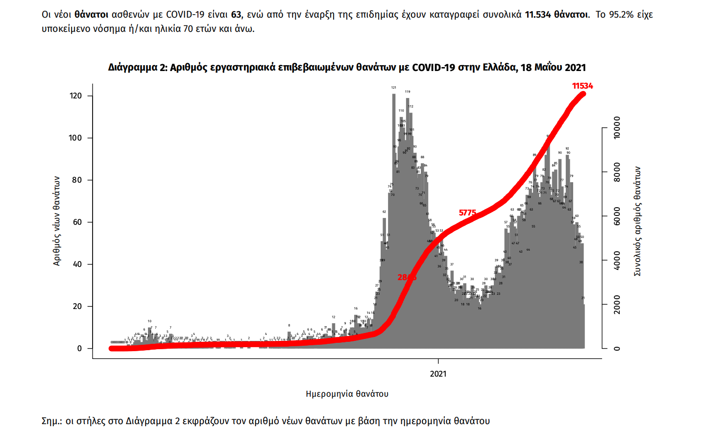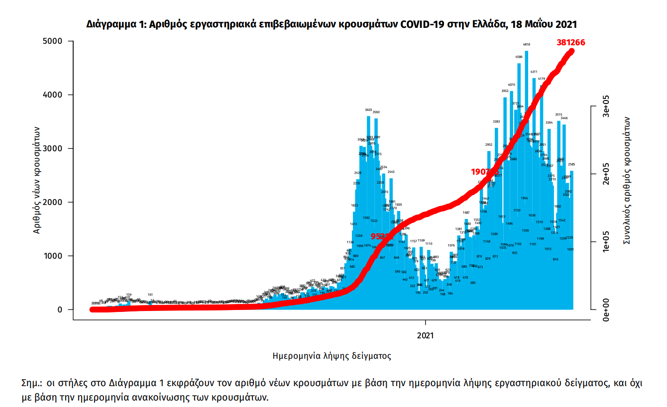 Τα στοιχεία που παρουσιάζονται αφορούν περιστατικά από την επιδημιολογική επιτήρηση της νόσου από το νέο κορωνοϊό (COVID19), με βάση τα δεδομένα που έχουν δηλωθεί στον ΕΟΔΥ και καταγραφεί μέχρι τις 18 Μαΐου 2021 (ώρα 15:00). Τα νέα εργαστηριακά επιβεβαιωμένα κρούσματα της νόσου που καταγράφηκαν τις τελευταίες 24 ώρες είναι 2.812, εκ των οποίων 2 εντοπίστηκαν κατόπιν ελέγχων στις πύλες εισόδου της χώρας.