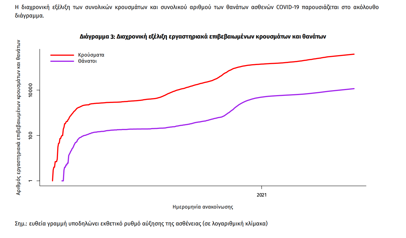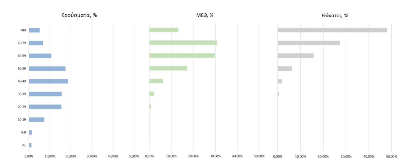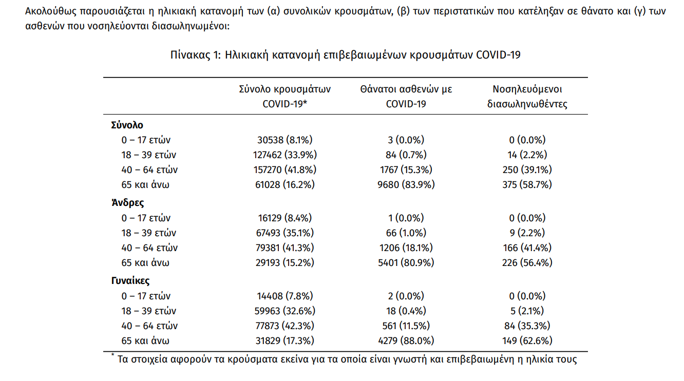 Ο αριθμός των ασθενών που νοσηλεύονται διασωληνωμένοι είναι 639 (62.8% άνδρες). Η διάμεση ηλικία τους είναι 67 έτη. To 82.8% έχει υποκείμενο νόσημα ή/και ηλικία 70 ετών και άνω. Από την αρχή της πανδημίας έχουν εξέλθει από τις ΜΕΘ 2.298 ασθενείς. Οι εισαγωγές2 νέων ασθενών Covid-19 στα νοσοκομεία της επικράτειας είναι 334 (ημερήσια μεταβολή +5.03%). Ο μέσος όρος εισαγωγών του επταημέρου είναι 319 ασθενείς.Η διάμεση ηλικία των κρουσμάτων είναι 44 έτη (εύρος 0.2 έως 106 έτη), ενώ η διάμεση ηλικία των θανόντων είναι 78 έτη (εύρος 0.2 έως 106 έτη).