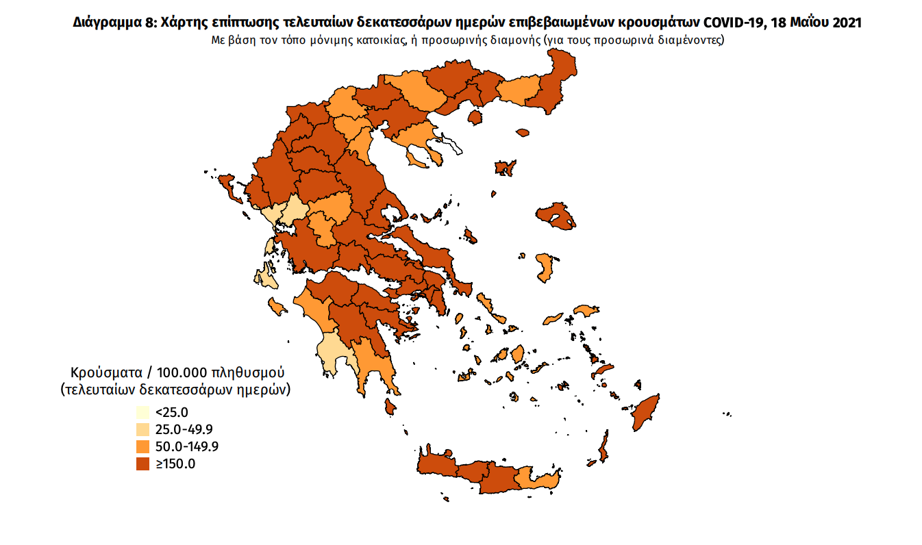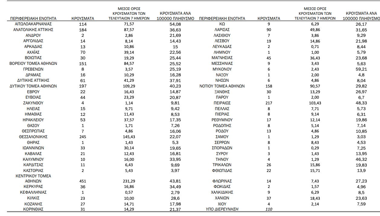 Γεωγραφική διασπορά: Ο χάρτης αποτυπώνει τη γεωγραφική κατανομή των συνολικών κρουσμάτων COVID-19 (από την αρχή της επιδημίας) ανά Περιφερειακή Ενότητα της χώρας, με βάση την δηλωθείσα διεύθυνση μόνιμης κατοικίας του ασθενούς, ή τη διεύθυνση προσωρινής διαμονής για τους τουρίστες και άλλους προσωρινά διαμένοντες στην Ελλάδα. Συμπεριλαμβάνονται τόσο κρούσματα με ιστορικό ταξιδίου (“εισαγόμενα”) όσο και κρούσματα με πιθανή εγχώρια μετάδοση.