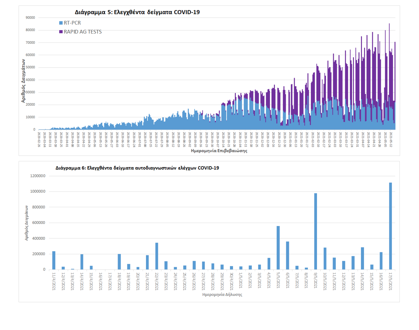 Δείγματα που έχουν ελεγχθεί: Από την 1η Ιανουαρίου 2020 μέχρι σήμερα, στα εργαστήρια που διενεργούν ελέγχους για τον νέο κορωνοϊό (SARS-CoV-2) και που δηλώνουν συστηματικά το σύνολο των δειγμάτων που ελέγχουν, έχουν συνολικά ελεγχθεί 4.901.080 κλινικά δείγματα ενώ από Μονάδες Υγείας και Κλιμάκια του ΕΟΔΥ που διενεργούν ελέγχους Rapid Ag έχουν ελεγχθεί 4.048.945 δείγματα. O μέσος όρος του επταημέρου είναι 52.539 δειγματοληπτικοί έλεγχοι. Αυτοδιαγνωστικοί έλεγχοι (Self-tests): Έως 17 Μαΐου 2021, έχουν καταγραφεί ηλεκτρονικά 6.673.941 δηλώσεις αποτελέσματος αυτοδιαγνωστικού ελέγχου, ενώ 152.068 άτομα προσήλθαν για επανέλεγχο. Mαζικές Δειγματοληψίες ΕΟΔΥ: Στις 17 Μαΐου 2021, πραγματοποιήθηκαν 134 δράσεις δειγματοληπτικών ελέγχων από τις Κινητές Ομάδες Υγείας (ΚΟΜΥ) του ΕΟΔΥ, στις οποίες διενεργήθηκαν 19.566 έλεγχοι Rapid Ag και ανευρέθηκαν 364 θετικά (1,86%).