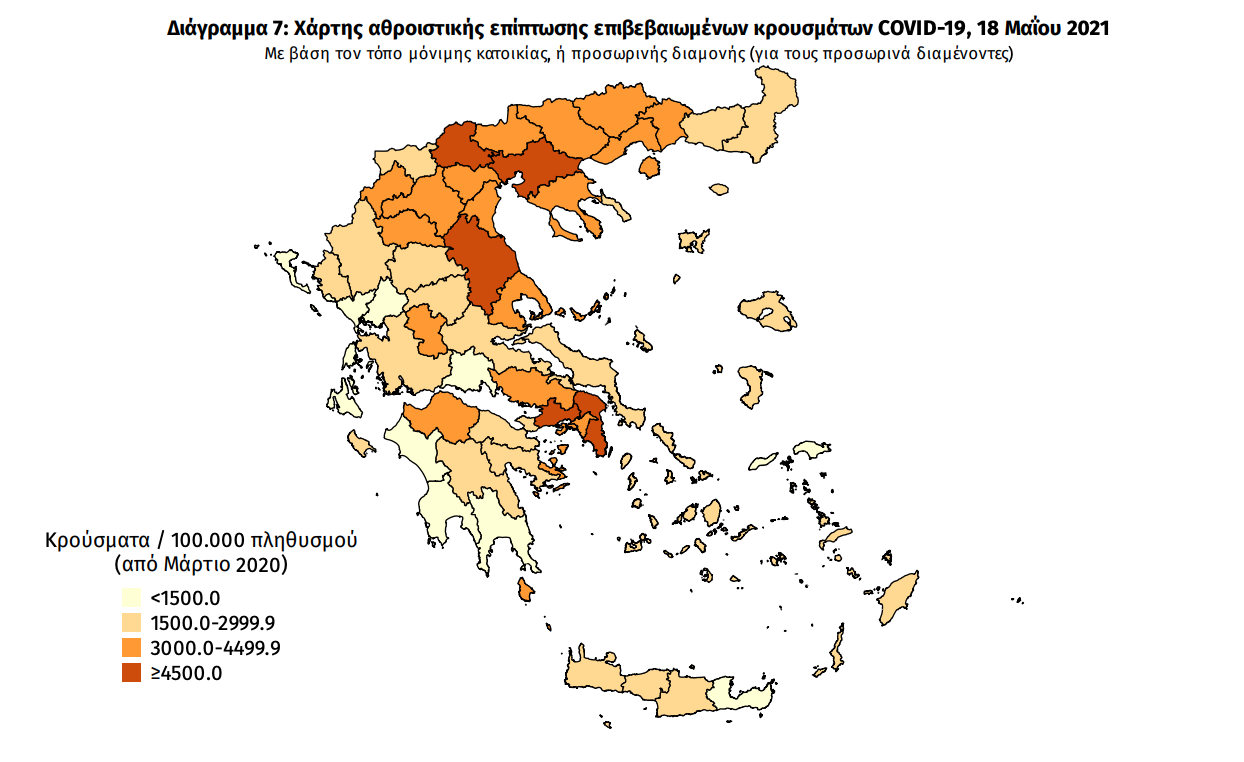 Κατανομή ανακοινωθέντων εγχώριων κρουσμάτων: Από το σύνολο των 2.812 νέων κρουσμάτων του νέου ιού στη χώρα 6 είναι εισαγόμενα εκ των οποίων 2 εντοπίστηκαν κατόπιν ελέγχων στις πύλες εισόδου της χώρας. Η κατανομή των 2.806 νέων εγχώριων κρουσμάτων ανά Περιφερειακή Ενότητα παρουσιάζεται στον κατωτέρω πίνακα.3 Πίνακας 2: Ημερήσιος αριθμός και κρούσματα ανά 100.000 πληθυσμού επιβεβαιωμένων εγχώριων κρουσμάτων COVID-19 ανά περιφερειακή ενότητα στις 18 Μαΐου 2021