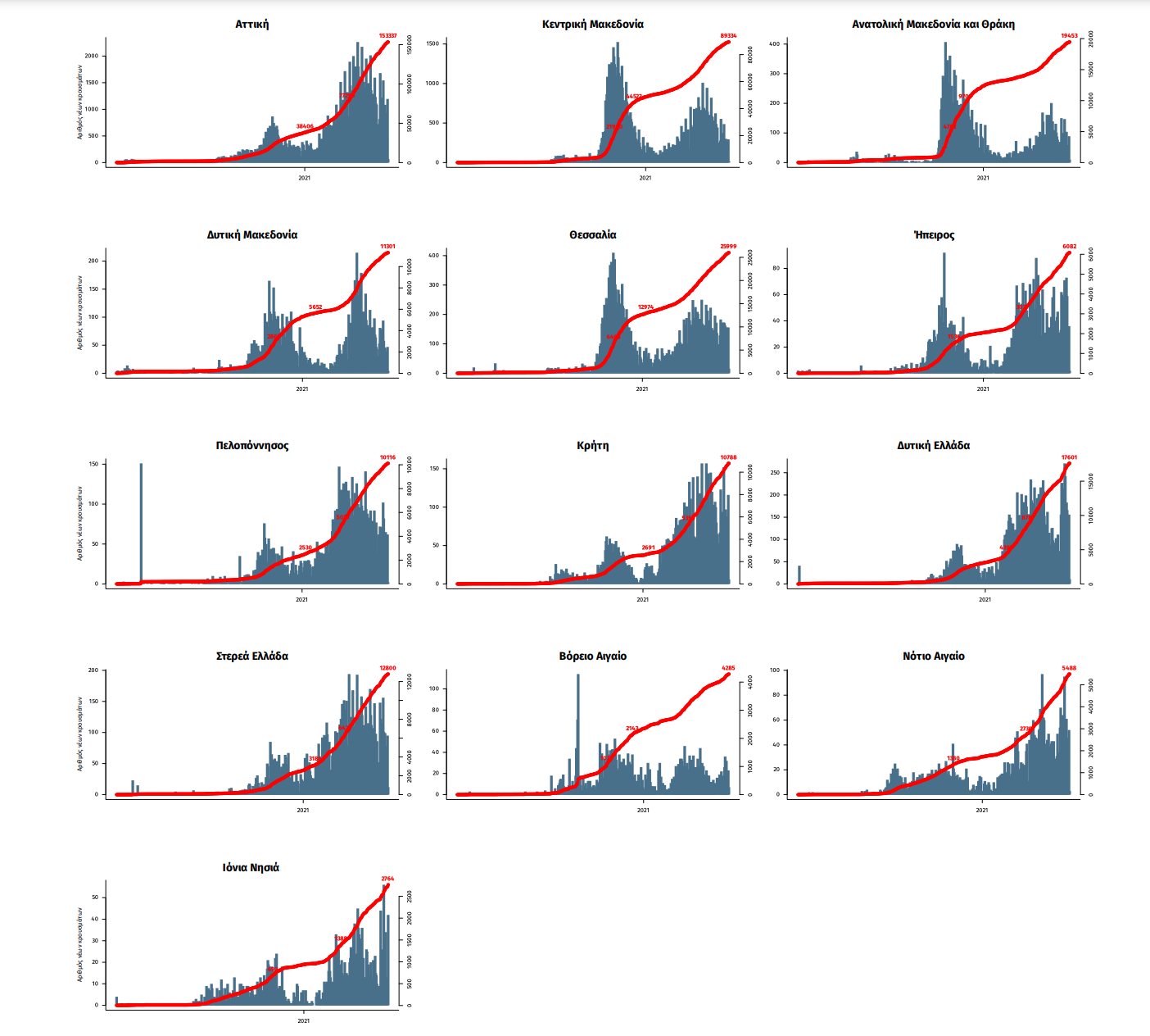 Παράρτημα 1: Επιδημικές καμπύλες κρουσμάτων COVID-19 με βάση την δηλωθείσα διεύθυνση μόνιμης κατοικίας του κρούσματος ή τη διεύθυνση προσωρινής διαμονής για τους τουρίστες και άλλους προσωρινά διαμένοντες στην Ελλάδα. Συμπεριλαμβάνονται τόσο κρούσματα με ιστορικό ταξιδίου όσο και κρούσματα με πιθανή εγχώρια μετάδοση.
