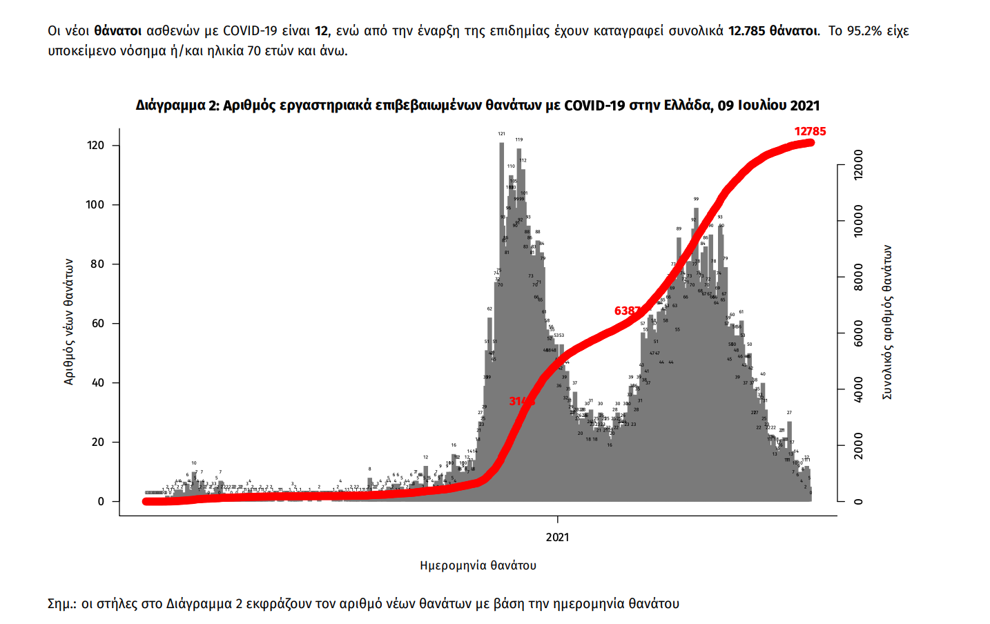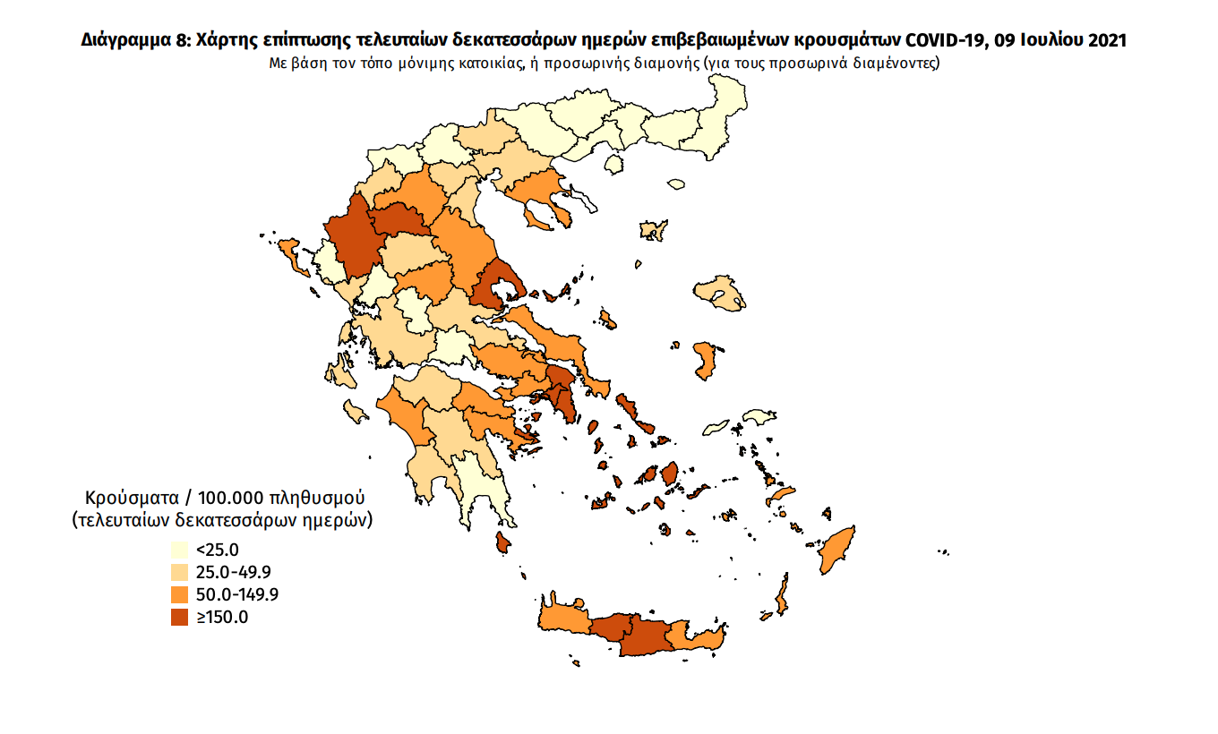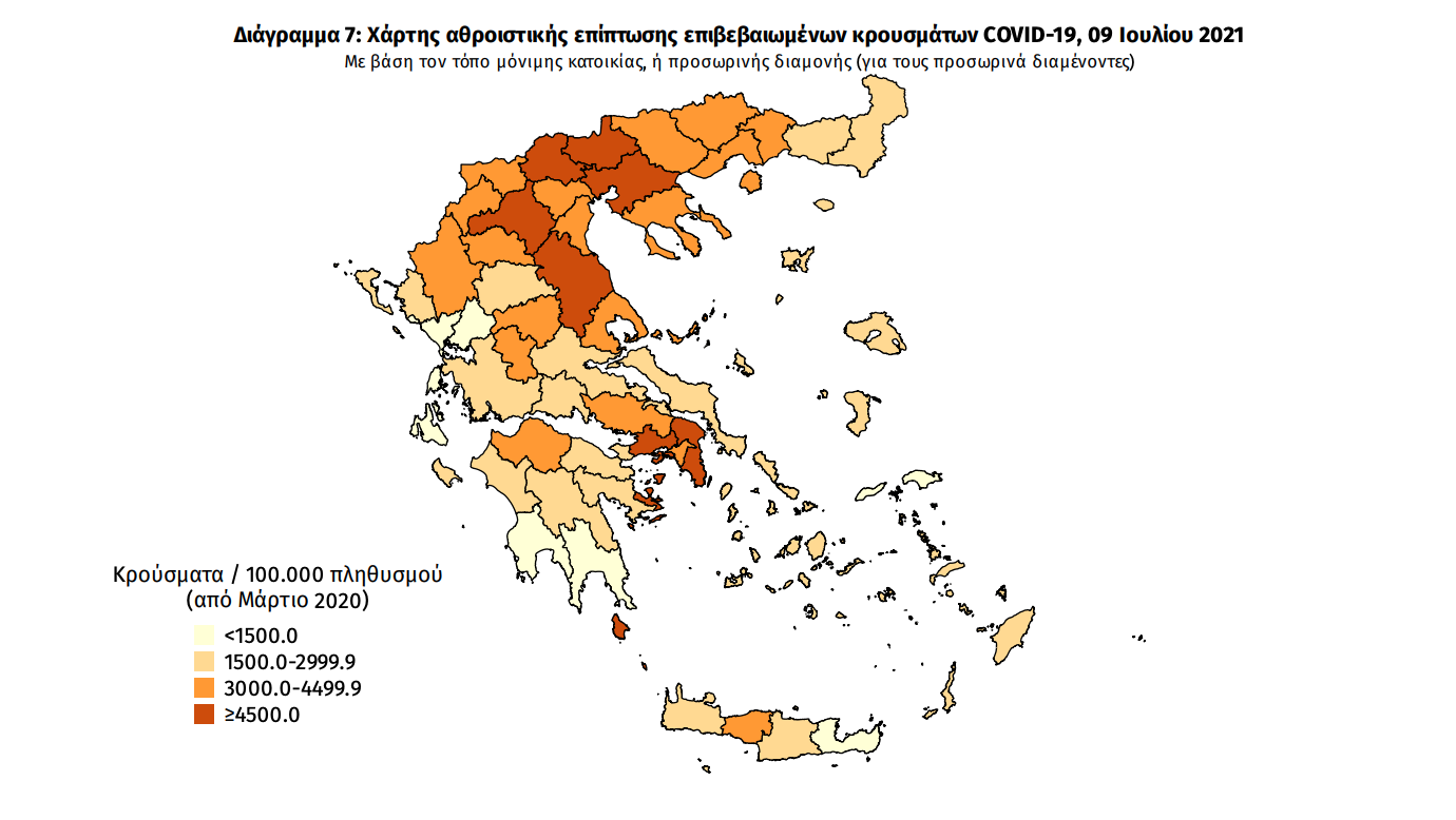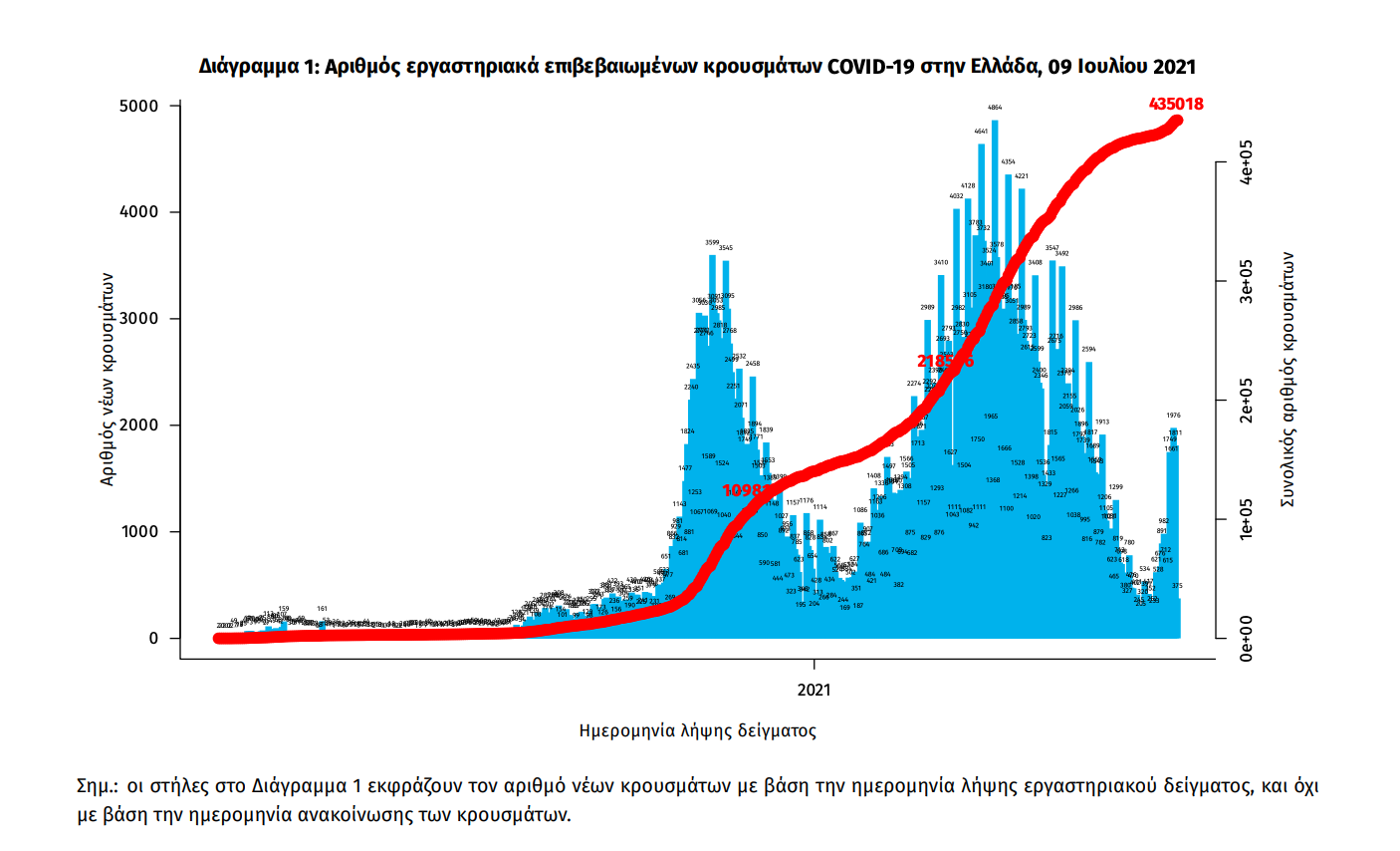 Τα στοιχεία που παρουσιάζονται αφορούν περιστατικά από την επιδημιολογική επιτήρηση της νόσου από το νέο κορωνοϊό (COVID19), με βάση τα δεδομένα που έχουν δηλωθεί στον ΕΟΔΥ και καταγραφεί μέχρι τις 09 Ιουλίου 2021 (ώρα 15:00). Τα νέα εργαστηριακά επιβεβαιωμένα κρούσματα της νόσου που καταγράφηκαν τις τελευταίες 24 ώρες είναι 1.997, εκ των οποίων 5 εντοπίστηκαν κατόπιν ελέγχων στις πύλες εισόδου της χώρας.