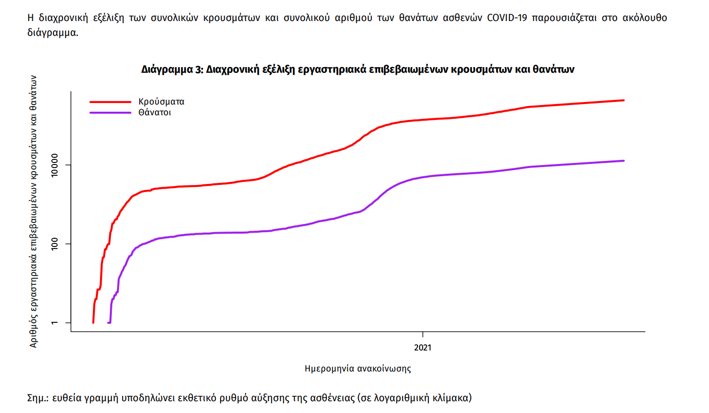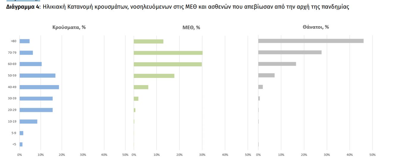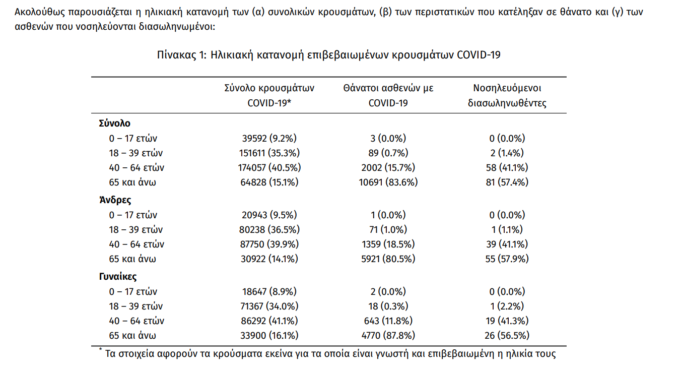 Ο αριθμός των ασθενών που νοσηλεύονται διασωληνωμένοι είναι 141 (67.4% άνδρες). Η διάμεση ηλικία τους είναι 66 έτη. To 88.7% έχει υποκείμενο νόσημα ή/και ηλικία 70 ετών και άνω. Από την αρχή της πανδημίας έχουν εξέλθει από τις ΜΕΘ 2.728 ασθενείς. Οι εισαγωγές1 νέων ασθενών Covid-19 στα νοσοκομεία της επικράτειας είναι 59 (ημερήσια μεταβολή -13.24%). Ο μέσος όρος εισαγωγών του επταημέρου είναι 53 ασθενείς.Η διάμεση ηλικία των κρουσμάτων είναι 43 έτη (εύρος 0.2 έως 106 έτη), ενώ η διάμεση ηλικία των θανόντων είναι 78 έτη (εύρος 0.2 έως 106 έτη).